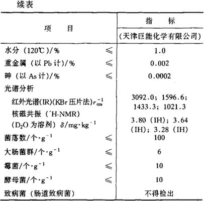 性状 白色颗粒,几乎无臭、无味,能溶于水,易溶于热水,不溶于醇、醚及氯仿。熔点高于330℃(分解),耐酸、碱性好,热稳定性强,120℃加热20min或200℃加热10min,无变化。