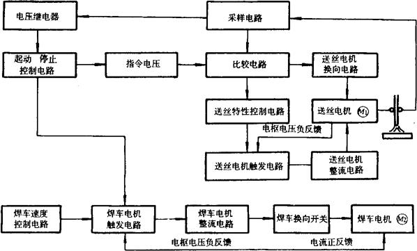 | 释义 | MZ-1000型焊机介绍 MZ-1000焊机是应用广泛的一种电弧电压自动调节、变速送丝的典型自动埋弧型焊机,它由焊车、电源、控制电路等组成。 1.工作原理 (1)MZ-1000型焊机控制原理框图(图4-19A):图中M2是焊车的行走控制电机,通过触发环节,改变整流电路晶闸管导通角,使输出电压改变,控制M 2直流电机的电枢电压,获得所需的小车行走速度——焊接速度。通过转换开关控制小车前进或后退。M1是送丝电机,通过指令电压,给定一个维持一定弧长的送丝速度,当平衡一旦破坏,电弧电压将通过采样、比较电路、送丝特性控制电路、送丝电机触发电路,改变送丝整流电路的晶闸管导通角,改变输出电压,使直流控制电机电枢电压改变,获得希望的送丝速度,维持给定的弧长。焊丝的反抽运动由送丝电机换向电路实现。