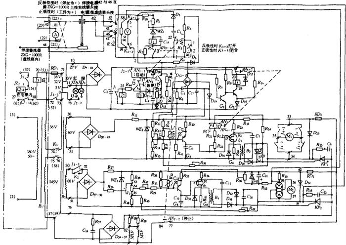 图4-19A MZ-1000型焊机电路控制原理框图 (2)MZ-1000型焊机电气原理图(图4-19B):图中点划线框内为MZ1000型焊机配用的ZXG-1000R直流焊接电源。R3、R5等组成采样电路,将电弧电压加到R4的两端,R4与D12-15整流桥组成比较电路。R4将电弧电压与“指令电压”(其值由电位计W1决定)反向串联后加到D12-15整流桥的交流端,该整流桥的交流端电压控制由G1、G2、J4等元件组成的“送丝电机的换向电路”通过J4-1-J4-4实现M1的正反转,实现焊丝的送进或反抽。整流桥的直流端电压则控制由G3、G4、B3等元件组成的“送丝电机触发电路”,这个触发电路还接受送丝电机电枢电压负反馈,用来控制由晶闸管KP1、二极管D25等元件组成的“送丝电机整流电路”,向送丝电机M1馈电。为了调节与校正送丝的最大速度与起始速度,由调整电位计起“送丝特性控制电路”作用,改善控制特性。“电压继电器电路”由继电器J1、稳压器WZ1及R1、C1、D5等元件组成。按钮AN1和AN2、继电器J2、J3、J5等元件组成焊机的“起停控制电路”。焊车速度控制由W2实现。G5、G6、B4等组成“焊车电机触发电路”。KP2、D32等元件组成“焊车电机整流电路”。K5作为“焊车换向开关”控制“焊车电机M2”的转向,以改变焊车运行方向。