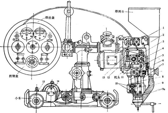 图4-20 MZT-1000型自动焊焊车 1-送丝电机 2-摇杆 3、4-送丝轮 5、6-矫直滚轮 7-圆柱导轨 8-螺杆 9-导电嘴 9a-螺丝(压紧导电块用) 10-螺丝(接电极用) 11-螺钉 12-调节螺母 13-弹簧 14-小车电机 15-小车车轮 (2)MZT-1000焊车的传动系统:图4-21是送丝机构的传动系统,图4-22是焊车行走机构的传动系统。