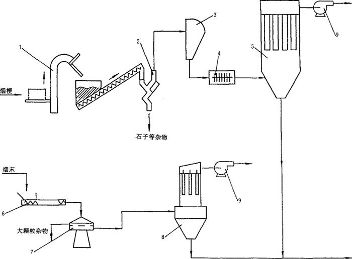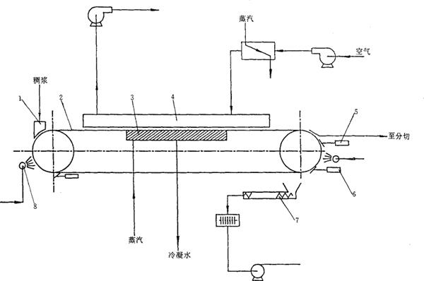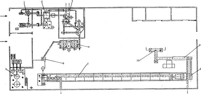 释义 | M.C.F稠浆法烟草薄片设备 1.结构特点 (1)M.C.F稠浆法烟草薄片生产线由原料处理系统、解纤制浆系统、稠浆调制系统、成型干燥系统及分切再干燥系统等组成,见图9-6-10所示。其平面布局可以根据建筑等条件调整 (2)原料处理系统主要包括原料除杂、配比、粉碎、筛分、储存等设备,见图9-6-11、图9-6-12所示。解纤制浆系统主要由配制罐、存储罐、计量泵、蒸汽加热器等组成,见图9-6-13所示。稠浆调制系统主要由高速搅拌机、存储罐、计量泵等组成,见图9-6-14所示。成型干燥系统主要由铺浆装置、烘干装置、铲刀、热风系统等组成,见图9-6-15所示。分切再干燥系统主要由分切机、干燥装置等组成,见图9-6-16所示。 图9-6-10 M.C.F稠浆法烟草薄片设备示意图 1-喂料设备 2-除杂、配比设备 3-粉碎设备 4-储存设备 5-解纤制浆设备 6-稠浆调制设备 7-成型干燥设备 8-分切设备 9-再干燥设备 10-包装设备 图9-6-11 原料除杂、配比设备示意图 1-烟梗喂料机 2-风分装置 3-落料器 4-切碎机 5-除尘器 6-烟末喂料机 7-振筛 8-除尘器 9-风机 图9-6-12 原料粉碎、筛选设备示意图 1-除铁装置 2-定量喂料机 3-粉碎机 4-除尘器 5-风机 6-振筛 图9-6-13 解纤制浆系统示意图 1-配制罐 2-输送泵 3-存储罐 4-计量泵 5-蒸汽加热器 图9-6-14 稠浆调制系统示意图 1-高速搅拌机 2-输浆装置 3-粘度计 4-存储罐 5-计量泵 图9-6-15 成型干燥系统示意图 1-铺浆装置 2-成型钢带 3-加热装置 4-热风系统 5-铲刀 6-钢带清洗装置 7-废料收集装置 8-脱膜剂喷涂装置 图9-6-16 分切再干燥系统示意图 1-分切机 2-风机 3-空气去湿器 4-风机 5-干燥装置 2.主要技术参数 见表9-6-15。 表9-6-15M.C.F稠浆法烟草薄片设备主要技术参数 3.生产厂家 瑞士TMCI公司。 |