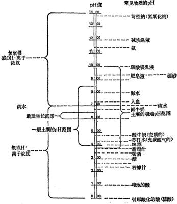 pH等级在图14.1中作了说明。一些常见物质的pH也表明在图14.1中。
