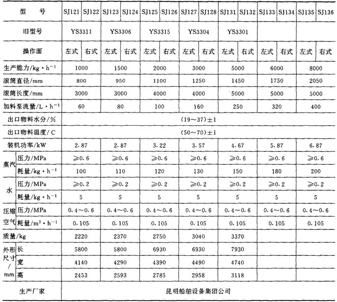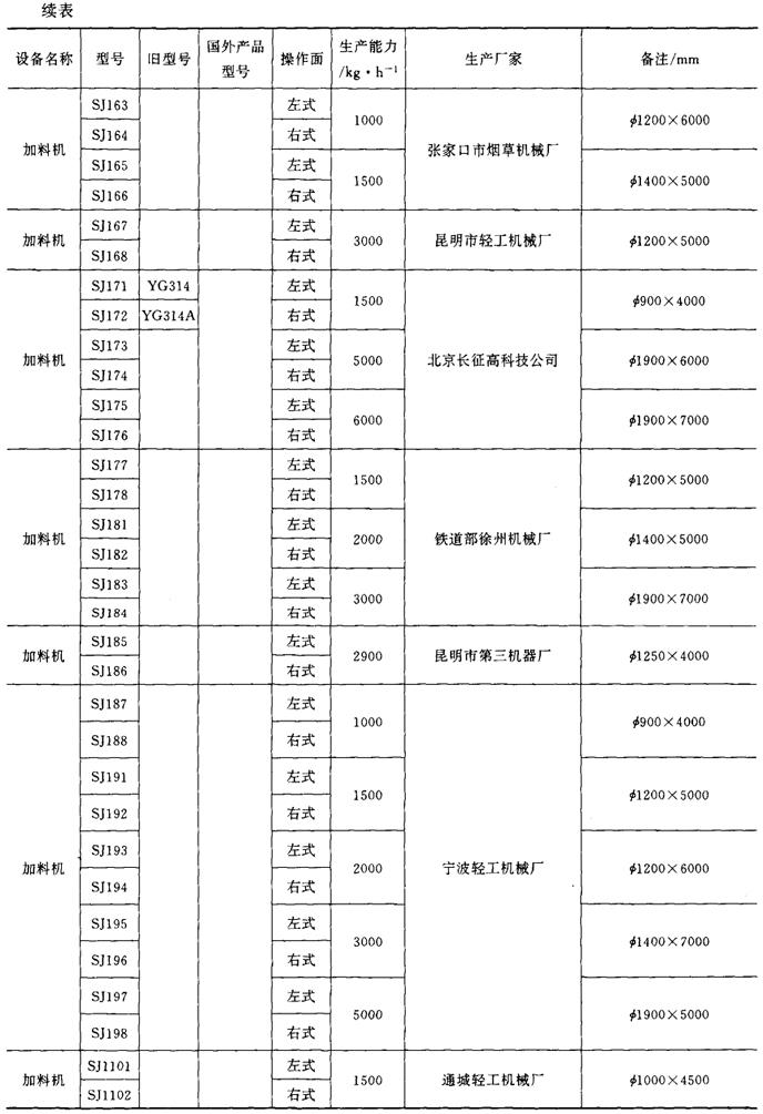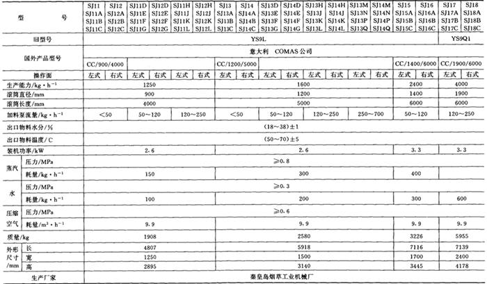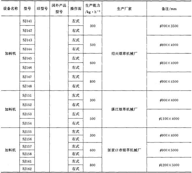 释义 | SJ型加料机 1.结构特点 SJ型加料机主要由滚筒、传动装置、料罐、管路系统、计量泵及排汽系统等组成。烟片进入旋转滚筒后,在呈螺旋式排列的拨料钉及重力的作用下,随倾斜的滚筒翻滚前进。在滚筒的进料口和出料口处均设置有蒸汽和料液喷嘴。料罐用蒸汽加热,并设有温度控制系统。根据烟叶流量和加料比例,自动控制料液量。设备可自动操作,亦可手动操作。 2.主要技术参数 该设备可用于叶片、烟梗和白肋烟片的加料,主要技术参数见表9-2-10和9-2-11所示。 表9-2-10SJ121~SJ128,SJ131~SJ136型加料机主要技术参数 表9-2-11SJ11~SJ18型加料机主要技术参数 注:SJ11~SJ18型及型号后加D、H、M者:筒体驱动为无级变速器;加水手控,加蒸汽、加料自控;料液泵滑差电机调速;型号后加A、E、J、N者,加水改为自控,其他不变;型号后加B、F、K、P者,筒体和料液泵驱动改为变频调速,其他不变;型号后加C、G、L、Q者,加水、加蒸汽、加料均自控,筒体和料液泵驱动为变频调速。 3.外形尺寸 SJ型加料机的设备外形见图9-2-9和9-2-10所示。 图9-2-9 SJ121~SJ128,SJ131~SJ136型加料机外形图 1-出料罩 2-排风机 3-电气系统 4-滚筒 5-机架 6-传动装置 7-进料口 8-三联计量泵 9-管路系统 10-料罐 图9-2-10 SJ11~SJ18型加料机外形图 1-出料罩 2-排风机 3-滚筒 4-机架 5-传动装置 6-进料口 4.生产厂家 见表9-2-10及表9-2-11。 5.其他型号的加料机 见表9-2-12所示。 表9-2-12 其他型号的加料机主要参数 |