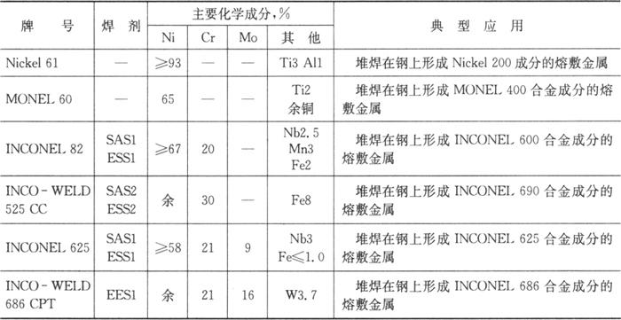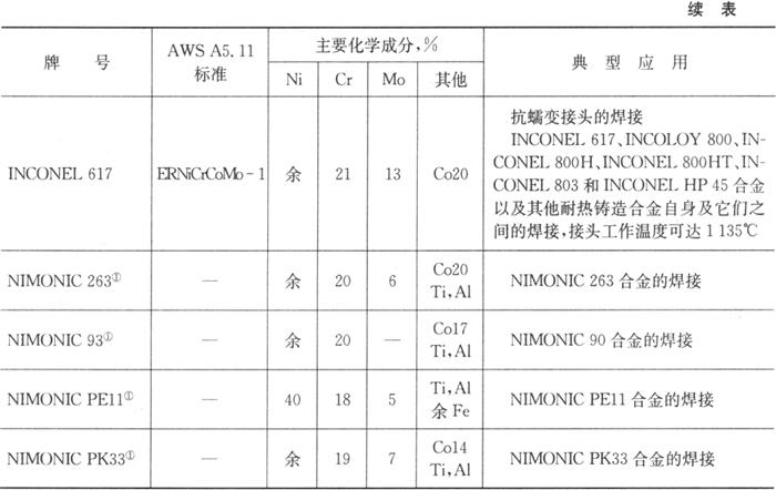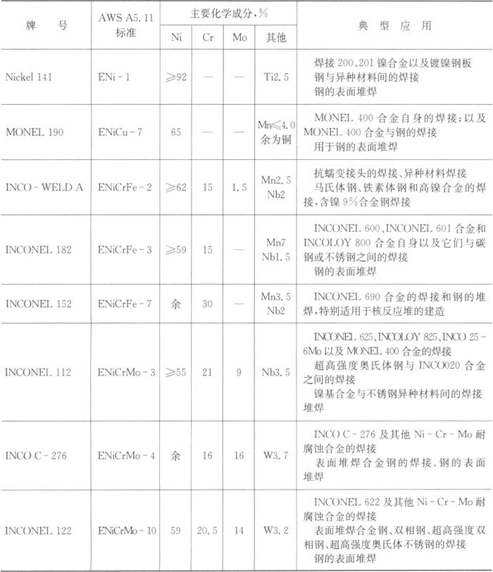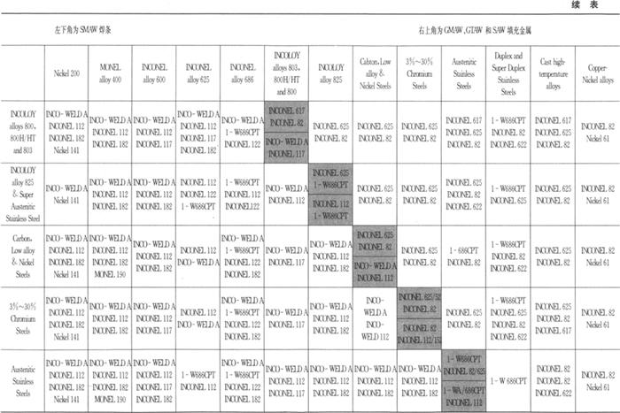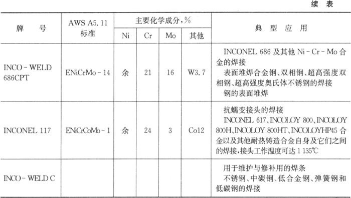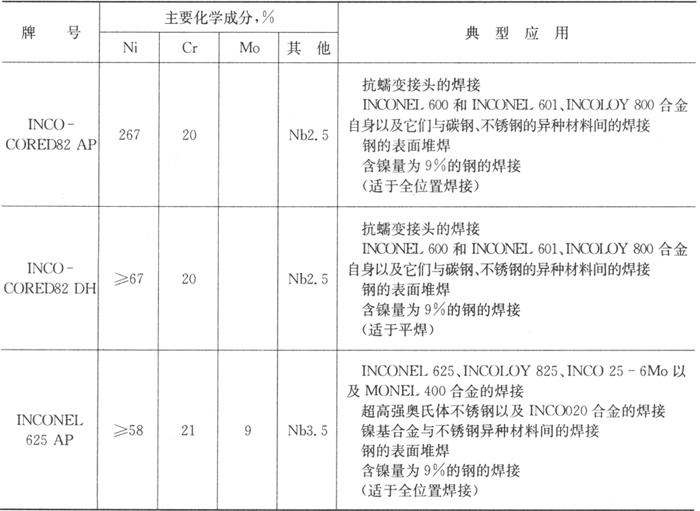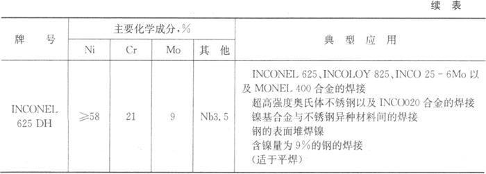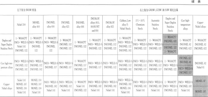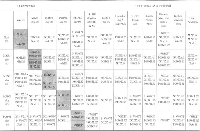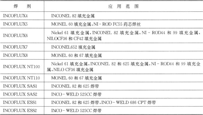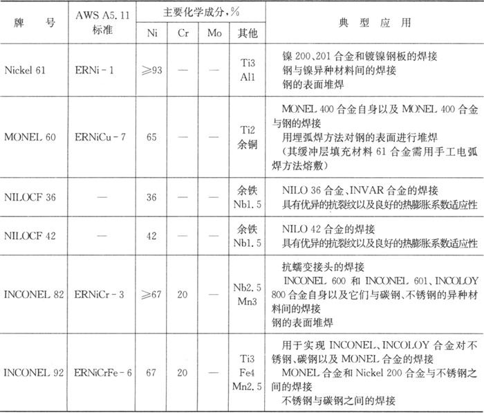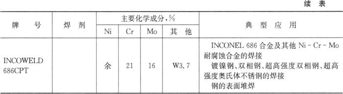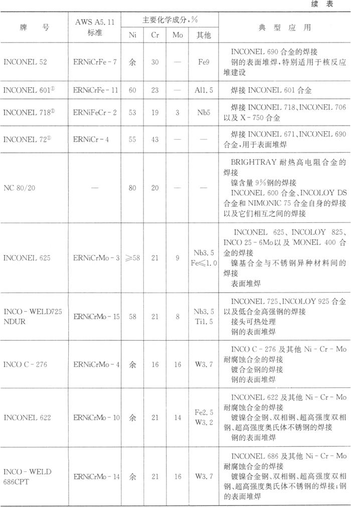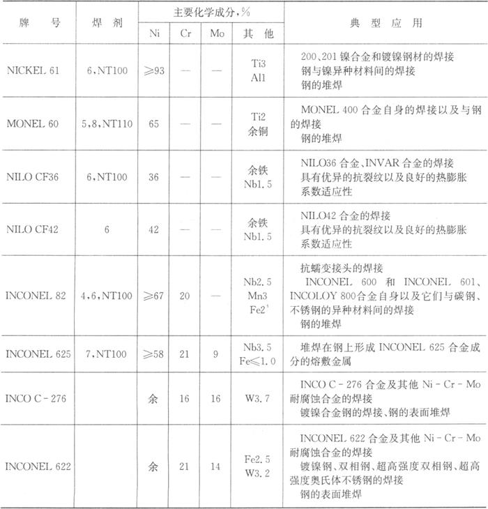 释义 | SMC国际超合金集团 SMC国际超合金集团生产的主要焊条焊丝的化学成分及典型应用见表5.7-1、表5.7-2、表5.7-3、表5.7-4、表5.7-5、表5.7-6和表5.7-7。 表5.7-1 SMC国际超合金集团生产的主要镍合金焊条 表5.7-2 SMC国际超合金集团生产的主要镍合金数焊丝和填充丝 注:①仅适用于GTAW。 表5.7-3 SMC国际超合金集团生的产主要镍合金药芯焊丝 表5.7-4 SMC国际超合金集团生产的埋弧焊及堆焊用镍合金焊丝 表5.7-5 SMC国际超合金集团生产的电渣堆焊和埋弧堆焊用镍合金焊带 表5.7-6 SMC国际超合金集团生产的用于焊接和堆焊的焊剂 表5.7-7 镍基合金焊接材料推荐表 |