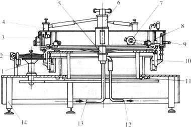 1-进瓶星轮 2-进瓶螺杆 3-阀控机构 4-液控机构 5-分液头 6-分气头 7-缸体升降调节机构 8-防冲板 9-灌装阀 10-托瓶气缸 11-平面止推轴承 12-清洗水排放口 13-灌装液(或清洗水)进入管 14-机架与罩板