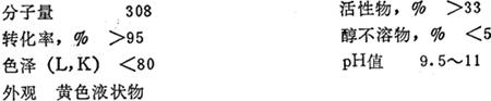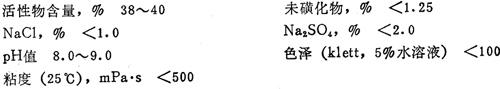 释义 | α-烯基磺酸盐 别名 AOS 结构式 RCH=CH 性能 黄色透明液体,有较好的乳化力、去污力、发泡力和钙皂分散力,极易溶于水,对皮肤的刺激性小。 质量规格(Stepan公司;日本狮子油脂公司) Stepan公司 日本狮子油脂公司 用途 用于轻垢洗涤剂、洗手剂、香波、液体皂及油田助剂等。 国内生产厂 轻工业部日化所。 国外生产公司 美国Stepan、Chemithon、Witco公司,日本狮子油脂、日本油脂公司,德国Hüls、Hoechst,法国RHONE-POULENC等。 |