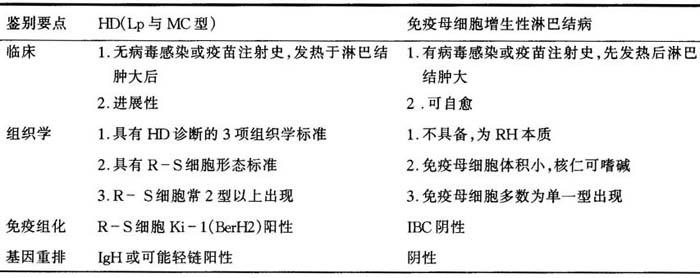 | 释义 | 一、HD总的鉴别诊断要点 (一)HD组织学诊断要点 HD组织学诊断依据有3项: (1)以诊断型R-S细胞为代表的系列R-S细胞,这是最重要的诊断依据。目前R-S细胞有6型,每型的形态特点要掌握好。①诊断型:双核或双叶核,嗜酸性包涵体样大核仁;②单核型:又称霍奇金细胞(H细胞),核型同诊断型;③多形型:多叶或多核,形态不规则,核型要求同诊断型;④陷窝型:胞浆空,核单个或多个,核仁小,嗜碱性;⑤L/H型:核表面略呈分叶状,有如爆破米花状,亦可为多核,核小、嗜碱性核仁,多见于HD-Lp型;⑥固缩型:体积大如R-S细胞,但核呈固缩状,是已死亡的R-S细胞,又称干尸细胞。真正的HD是以某一型R-S细胞为主,同时有2型以上R-S细胞系列出现,其中诊断型R-S细胞具有诊断的代表性,这是与良性大细胞增生淋巴结病之鉴别要点。 (2)其背景为良性多细胞组成的增生性淋巴组织,这也是与NHL易造成误诊的原因。 (3)淋巴结结构部分或全部破坏,这也是体现其为恶性的要点之一。同时伴扩散转移。 (二)免疫母细胞增生性淋巴结病的免疫母细胞与H/R-S细胞的鉴别诊断 HD最容易与免疫母细胞增生性淋巴结病相混淆而误诊。后者最常见的是病毒感染或病毒性疫苗引起的淋巴结病。如传染性单核细胞增生症淋巴结、病毒性或病毒性疫苗后淋巴结病,其突出的特点是体积大的免疫母细胞(IBC)散在增生,偶有双核出现(表6-21)。如果对R-S细胞的形态特点了解不够,就会误诊。 表6-21 HD(Lp与MC型)与免疫母细胞增生性淋巴结病的鉴别