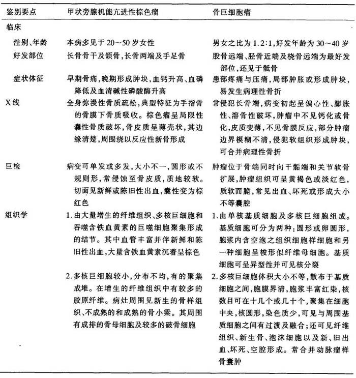 表13-13 甲状旁腺机能亢进性棕色瘤与骨巨细胞瘤的鉴别要点