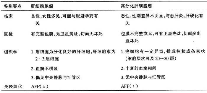 释义 | 一、肝细胞腺瘤与高分化肝细胞癌的鉴别诊断 肝细胞腺瘤虽然不多见,但为良性。在组织学方面与高分化肝细胞癌十分相似。故要认真进行鉴别诊断(表3-20)。 表3-20 肝细胞腺瘤与高分化肝细胞癌的鉴别 |