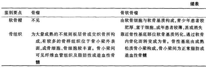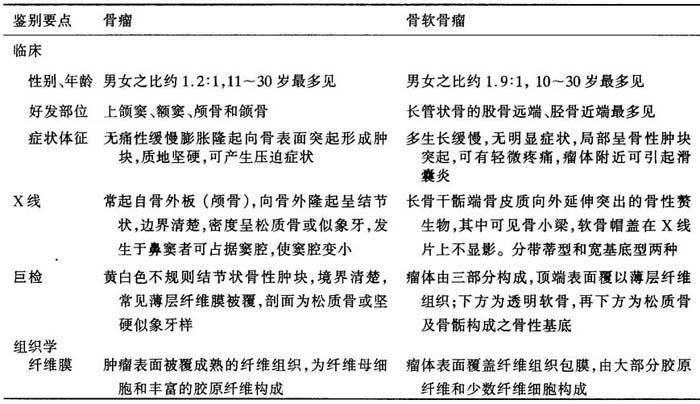 释义 | 一、骨瘤与骨软骨瘤的鉴别 骨瘤是发生在颅面部膜内化骨的良性肿瘤,主要由成熟的板层骨或交织骨所构成。骨软骨瘤也是最常见的良性骨肿瘤,发生于软骨内化骨的骨骼——四肢长管状骨干骺端邻近骨骺部位,除骨性基底外,表面覆以软骨帽。陈旧性骨软骨瘤,由于软骨帽骨化,因而易与骨瘤混淆(表13一1)。 表13-1 骨瘤与骨软骨瘤的鉴别要点 |