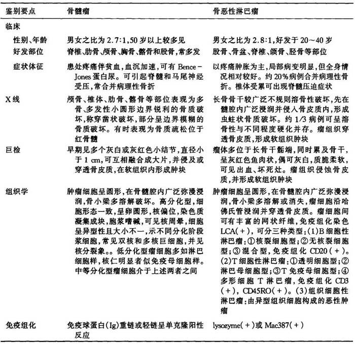 骨髓瘤是单克隆的浆细胞恶性肿瘤,因此也称为浆细胞性骨髓瘤,瘤细胞源自骨髓腔,同时侵犯多处骨,所以又称为多发性骨髓瘤。骨其他恶性淋巴瘤较罕见,属于骨骼原发性淋巴组织恶性肿瘤,旧称骨网织细胞肉瘤。一般都是非霍奇金恶性淋巴瘤,可分为T、B及组织细胞性三大类。另外肿瘤分化程度不同,形态上多种多样。二者组织学共同特点均为圆细胞肿瘤,尤其是低分化型骨髓瘤细胞多似淋巴细胞样,核仁明显者似免疫母细胞样,因此,应仔细与骨恶性淋巴瘤鉴别(表13-16)。
