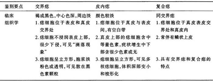 释义 | 一、黑色素细胞(色素)痣 是由黑色素性痣细胞形成的良性肿瘤。痣细胞的形态多种多样,有大小圆形、气球形、多边形、梭形和树枝形等,在皮肤不同部位可能形状不同,表皮及真皮上部的痣细胞似上皮样细胞,真皮中部的痣细胞较小,很少含色素,真皮下部痣细胞呈梭形,但其共同的特点是常形成巢。常见有皮内痣、复合痣及交界痣等,鉴别如表12-6。 表12-6 交界痣、复合痣、皮内痣的鉴别 |