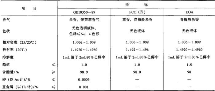 性状 无色液体,沸点240℃,闪点107℃。不溶于水、丙二醇、甘油,溶于乙醇和油。具有重的、果花香气,主要是似梅子的果香。