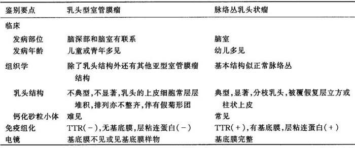 室管膜瘤有时也可形成乳头体伴有假菊形团结构,与脉络丛乳头状瘤相似,鉴别见表9-9。