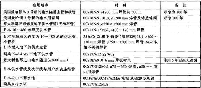不锈钢在水处理厂、供水系统以及室内水管中的应用的冶金产品为不锈钢焊管,管接头、法兰、阀门和紧固件等。实际应用状况见表2-44、表2-45。