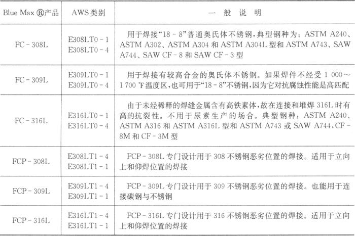 释义 | 不锈钢药芯焊丝生产厂商举例 林肯公司推出的不锈钢药芯焊丝,如Lincoln Electric’s Blue Max气保护药芯焊丝为焊接不锈钢的优质焊丝。其特点是容易操作、低飞溅、去渣容易和成型美观。Blue Max FC焊丝可用于向下焊和横焊,而Blue Max FCP则可用于全位置焊,特别是向上立焊和仰焊。见表3.4-1。 表3.4-1 林肯公司的不锈钢药芯焊丝 |