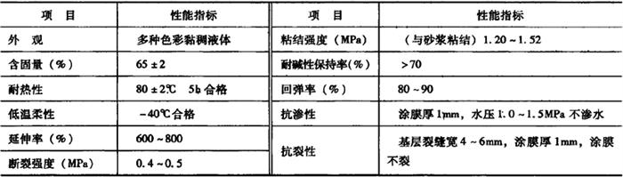 | 释义 | 丙烯酸防水涂料 (一)高级丙烯酸酯防水涂料 1.高级丙烯酸酯防水涂料的特点 高级丙烯酸酯防水涂料,系以高弹性丙烯酸酯共聚型橡胶为主要原料,采用高新技术研究开发的一种彩色弹性建筑防水涂料。这种防水涂料为水性涂料,施工非常简单,可在潮湿的基层上直接喷涂;对任何形状复杂的基层,均可形成一层连续整体的密封防水层;若发现渗漏,只需要进行局部修补,省时、省力、省费用;与建筑基层的粘结力强,成膜面延伸率大,富有弹性,抗腐蚀;可以配制成各种颜色,起到美化和隔热的作用。总之,该防水涂料具有无毒、无味、无污染、耐严寒、耐高温、耐老化、耐腐蚀、防水性好、施工方便、综合性能优异等特点,是一种理想的冷施工建筑防水涂料。 2.高级丙烯酸酯防水涂料的适用场合 高级丙烯酸酯防水涂料适用于混凝土屋面、天沟、雨篷及各种形状复杂的防水部位;地下建筑的混凝土内外墙、底板、电梯坑、地下隧道、沉井、管道等;地面建筑的卫生间、浴室、厨房、水池、花坛等。 高级丙烯酸酯防水涂料的技术性能见表10-71。 表10-71 高级丙烯酸酯防水涂料的技术性能