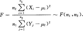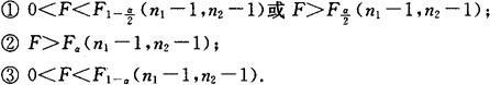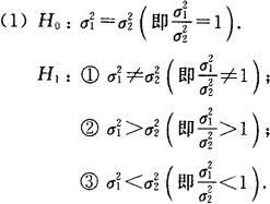 释义 | 两正态总体方差比的假设检验 1.μ1,μ2均已知 (2)统计量 (3)给出α,H0的拒绝域为: ① ②F>Fα(n1,n2); ③0<F<F1-α(n1,n2). 2.μ1,μ2均未知 (1) H1:① ② ③ (2)统计量 (3)给出α,H0的拒绝域为 |
