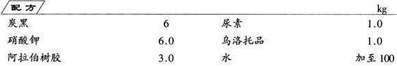 首先将阿拉伯树胶用水浸泡后放入带有加压设备的容器中,在压力为196.2~294.2kPa和温度为130℃下处理3h,使之成为易流动的胶状物。接着按配比加入尿素、硝酸钾和乌洛托品,并充分搅拌,混合,然后再慢慢加入炭黑,继续搅拌,混合均匀,并经研磨成浆状物,即为产品。用温水稀释即可使用。