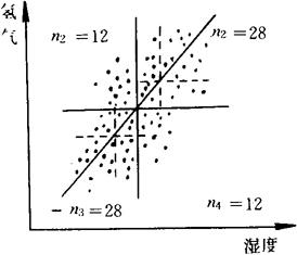 (3)两条纵横中位数直线把图中的点子分为四个区域,在每个区域内计算点子数。右上区域的点子数为n1,左上区域的点子数为n2,左下区域的点子数为n3,右下区域的点子数为n4。