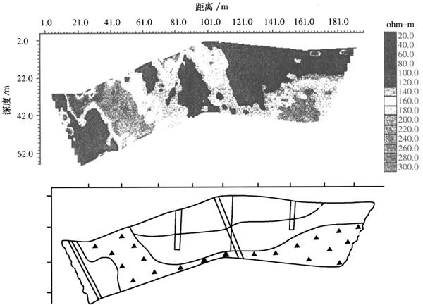 释义 | 中里滑坡高密度电阻率法,瑞雷波法勘探 中里滑坡位于吉林省图们市至延吉市之间,因原山脊由于高速公路路基开挖而被切断,形成边坡,并于1998年产生一定规模的滑坡,后缘出现大量弧形裂缝,严重影响着高速公路的安全。滑坡平面总面积1.7×104m2,南北长约为25m,东西宽约135m。为此需要查明滑坡体的几何形态,以便为进一步治理提供基础资料。 为了确定滑坡的几何界面形态及埋深,采用高密度电法勘探和瞬态多点瑞雷波勘探相结合的方法。 图2-20为Ⅰ测线的电阻率剖面图及其地质解译剖面,从图上可以清楚地反映出侵入上部砂岩中的花岗岩岩体界面形态以及砂岩内软弱夹层的几何形态。由于侵入的花岗岩较为完整,故其电阻率值比较高,在剖面上反映为高电阻率带,因此其界面的形态比较容易识别。泥化夹层物性较软弱,由于其富水程度不同,在剖面上电阻率有所不同。在地下水位以下的泥化夹层,其表现为低阻体,而在地下水位之上部分,则表现为高阻体,且在电阻率剖面上呈现一串珠状的电阻率异常带。利用该方法提供的岩性接触带和滑坡带位置与后期的钻探资料相吻合。 图2-20 Ⅰ测线高密度电阻率剖面及地质解释剖面 图2-21为一级平台不同位置上瑞雷波速度与深度关系曲线。由于该方法直接提供滑面的埋藏深度,可对该测线上的高密度电法勘探资料进行定量校正。 图2-21 一级平台瞬态多点瑞波解译剖面图 通过以上两种物探方法的综合勘探,基本查明了滑坡体的界面特征以及构造发育情况,为进一步整治提供了较为可靠的基础资料。因此,充分利用综合物探方法进行滑坡体的调查是一种行之有效的手段(牛建军等,2000)。 【参考文献】: 邓清禄.2000.斜坡变形构造.武汉:中国地质大学出版社 段永侯,罗元华,柳源等.1993.中国地质灾害.北京:中国建筑工业出版社 姜卫方,万明浩.2000.地质雷达在滑坡面调查中的应用及效果分析,物探与化探,24(3) 金培杰,曹玉立.1993.甚低频电磁法在确定滑坡地下水分布中的应用.物探与化探,17(2) 金培杰,曹玉立.1992.静电α卡法在探测滑坡地下水中的应用.中国地质灾害与防治学报,3(3) 李媛,张颖,钟立勋.1992.中国滑坡崩塌类型及分布图说明书.北京:中国地图出版社 李智毅,王智济,杨裕云.1996.工程地质学基础.武汉:中国地质大学出版社 李智毅,唐辉明.2000.岩土工程勘查.武汉:中国地质大学出版社 李大心.1994.探地雷达方法及其应用.北京:地质出版社 刘传正.2000.地质灾害勘查指南.北京:地质出版社 牟会宠.1987.滑坡.北京:地震出版社 牛建军,张晓培,邱慧.2000.综合物探方法在中里滑坡调查中的应用.水文地质工程地质,27(3) 孙纪荣.1989.三峡黄腊石滑坡与K剖面法电法勘探工程物探.工程物探 王谦身,张赤军,周文虎等.1995.微重力测量——理论、方法与应用.北京:科学出版社 晏同珍,杨顺安,方云.2000.滑坡学.武汉:中国地质大学出版社 张咸恭,李智毅等.1998.专门工程地质学.北京:地质出版社 地球物理地球化学勘查研究所.1983.日本工程物探译文集 |