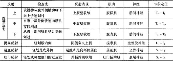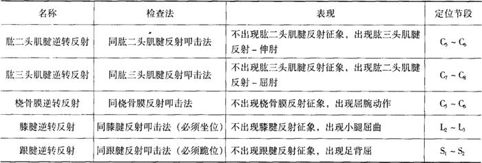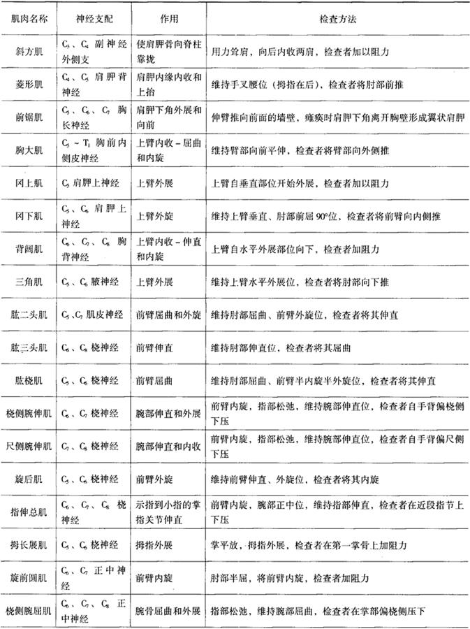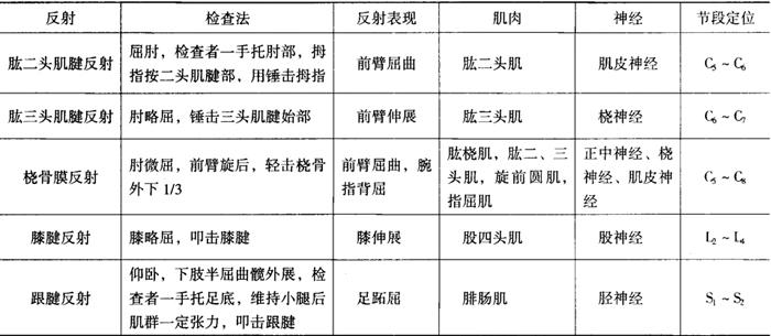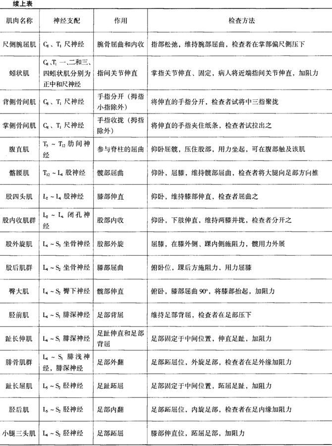 释义 | 临床检查 一、运动系统 大部分神经系统疾病出现运动障碍,脊髓疾病更是如此,是严重影响病人工作、学习、生活的突出症状。运动是脊髓的重要功能之一,因此运动检查对于脊髓疾病的诊断、定位极为重要。 (一)姿势和步态 姿势和步态与本体感觉、各部位的肌力、肌张力以及小脑、前庭等机能密切相关,是一系列复杂的神经机能与反射活动综合起来所表现的主动肌肉活动的结果。对全瘫病人要注意其在卧位的姿势;对不全瘫病人,还要注意在坐位、立位及行走的姿势。 枕颈部损伤,常呈强迫头位,如头稍前屈、侧屈,或枕部朝向患侧肩峰;卧位时只采取一种姿势,如强令改变头位,将引起剧痛,或甚至有眩晕、呕吐等。腰椎损伤累及一侧腰、骶神经根时,病人常有侧凸,腰椎曲度变平或甚至后凸等。 痉挛性瘫痪病人由于伸肌及内收肌紧张,步行时,髋关节活动很差,膝关节不能或只能稍做屈曲,步态僵直、拖曳。某些脊髓后侧综合征,后索严重受累,由于本体感觉传导障碍,病人对肢体活动不能有效地控制,行走时跨步过大,抬足过高、落地不稳,白天尚能靠视力纠正,但夜晚却无法行走。 (二)肌营养 肌营养情况反映在肌肉体积的大小。检查时应注意肌肉有无萎缩和肥大;如果有应注意是全身性、偏侧性、对称性或散发性,还是局限于某周围神经支配区还是某关节周围区。最容易观察和不应忽略的部位有大鱼际肌、小鱼际肌,下肢的股四头肌、股前肌和腓肠肌以及足背的伸趾短肌等。 (1)肌肉萎缩:是指肌肉体积变小,甚至消失。决定一个肌肉有否萎缩应与对侧相比较,肌肉外形变小或呈凹陷,常常提示肌肉萎缩。亦可用卡带测量肢体的周径,测量时应选择生理骨隆起(如尺骨茎突、髌骨及踝部)为标志,在其上或下一定距离水平测量肢体的周径,以确定有关萎缩及其程度,同时可作为以后随访的比较。因为发育不对称并非少见,尤其腓肠肌,所以两侧肢体周径的轻微差异并不能作为肌萎缩的根据。 (2)肌肉肥大:是指肌肉体积较正常增大。其检查方法与肌肉萎缩同。肌肉的大小与年龄、性别、一般体格、营养状况、职业及个别肌肉的锻炼而有所不同。因此对某些病人决定其肌肉肥大或萎缩必须了解有关情况。 (三)肌张力 肌张力是指肌肉在静止状态下的紧张度,即在肌肉松弛时被动运动中所遇到的阻力。正常肌张力的维持是依靠肌梭上的花枝形感受器在肌紧张度降低时输入冲动引起肌肉收缩,其环旋形感受器又在肌纤维长度突然拉长时输入冲动引起肌肉收缩(牵张反射)。而持续的牵伸可以刺激肌腱中的高尔基体使收缩受到抑制(伸长反应)。这些反射可为反射弧上的病变所消除,肌腱挛缩、关节僵硬等都影响肌张力的检查。 肌张力检查必须在温暖的环境和舒适的体位中进行。应再三嘱咐病人尽量放松,避免紧张影响检查效果。检查时握住病人的肢体,以不同的速度和幅度来回活动肢体各关节,仔细体会感受到的阻力,并两侧比较。尤应注意前臂的内旋-外旋,膝部的屈曲-伸直。除被动运动外,还应认真触摸肌肉的硬度。 肌张力低时,肌肉松软,被动运动阻力降低,关节运动可出现过伸现象。肌张力减低见于脊髓前角(下运动神经元)病变、脊髓后索病变、小脑病变,某些肌病、脑及脊髓急性病损的休克期。 肌张力增高时,则触摸肌肉较坚硬,被动运动时阻力增大,可分为痉挛性和强直性两类。痉挛性肌张力增高,见于锥体束受损时,脊髓反射受到易化,快速地牵伸在缩短状态中的肌肉时立即引致收缩,阻力增大,牵伸到一定程度时阻力又突然消失。通常称之为“折刀征”。强直性肌张力增高,主要是指锥体外系统病变中的特殊肌张力变化。此时,调节肌紧张度的脊髓反射受到易化,而调节肌长度的反射受到抑制。被动动作时所遇到的阻力一般比痉挛性者小,与肌肉当时的长度即收缩形态无关。伸肌和屈肌张力同时增强,无明显区别。无论动作的速度、幅度、方向如何,都遇到同等阻力。这种阻力增高称为铅管样强直。如果因伴发震颤,可在均匀一致的阻力下产生交替性松弛、紧张的变化,检查者感觉似齿轮转动或拉锯样,故又称齿轮样或轮锯样强直。对于潜隐性肌张力增高,一般方法检查不出肌张力增高者,可嘱病人抬高一侧下肢,再检查该侧上肢的肌张力,可查出肌张力增高,可见于锰中毒的早期。 (四)肌力 1.评级标准 各肌肉的肌力分为6级: 0:完全瘫痪。 1:可触及或可见肌收缩。 2:在无地心引力下进行全关节范围的主动活动。 3:对抗地心引力进行全关节范围的主动活动。 4:在中度抗阻下进行全关节范围的主动活动。 5:正常肌力(可完全抗阻进行全关节范围的正常活动)。 NT:无法检查。 2.肌力检查法 在关节主动运动时施加阻力于所测肌肉对抗,测量其肌力,并进行双侧对比。全身肌肉大致可分为颈部和躯干肌肉、肩带和上肢肌肉、骨盆带和下肢肌肉3组。各组肌力检查法见表7-1。 表7-1 全身各肌肉检查法 3.必查项目 美国脊髓损伤学会(ASIA)建议,脊髓损伤评定时运动检查的必查项目为检查身体两侧各自10对肌节中的关键肌。检查顺序为从上向下。选择这些肌肉是因为它们与相应节段的神经支配相一致,并且便于临床做仰卧位检查(在脊髓损伤时其他体位常常禁忌)。 C5——屈肘肌(肱二头肌,肱肌) C6——伸腕肌(桡侧伸腕长肌和短肌) C7——伸肘肌(肱三头肌) C8——中指屈指肌(