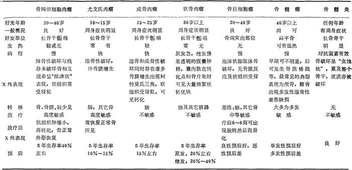 释义 | 临床特点、检查方法、鉴别诊断及分期 16.3.1 临床特点及检查方法 性别和年龄 骨软骨瘤、软骨肉瘤及骨肉瘤等较多发生于男性。脊索瘤极大多数发生于男性,女性极少见。骨巨细胞瘤、纤维异常增殖症等的发生则无明显性别差异。骨软骨瘤、骨肉瘤、尤文氏肉瘤多发于10~15岁、骨巨细胞瘤、骨网织细胞肉瘤多发于20~40岁,脊索瘤、多发性骨髓瘤、转移瘤多发于40~50岁,及50岁以上。 部位 在全身骨骼中发生于四肢长骨的肿瘤较躯干骨多。前者如骨肉瘤、骨巨细胞瘤、尤文氏肉瘤、骨组织细胞肉瘤等。后者如骨髓瘤、脊索瘤、转移瘤等。 症状和体征 疼痛和压痛是常见的症状,尤以夜间为甚,恶性肿瘤更明显。浅表部位肿瘤可能触到所在骨膨胀变形,骨壳菲薄时可有捏乒乓球样感。骨肿瘤穿破到骨外产生大小不等固定的软组织肿块、肿胀、皮肤温度增高、发红等。另外可引起病变部位功能障碍,压迫症状,畸形,病理性骨折等。化验检查:硷性磷酸酶于骨肉瘤时可增高,经手术或放疗后硷性磷酸酶可下降;如肿瘤复发或转移则又可再度增高,一般硷性磷酸酶愈高预后愈差。 X线表现 X线检查对骨肿瘤的诊断很重要,须注意下列各项。 (1)部位:可确定肿瘤起源于骨内还是由邻近软组织肿瘤所引起的继发性骨质破坏、肿瘤系单发还是多发。 (2)肿瘤影像。 (3)骨质反应:良性肿瘤多为膨胀性生长,与周围正常骨界线清楚。恶性肿瘤呈浸润性生长,沿髓腔及皮质骨扩散,没有明显边界。 (4)骨膜反应:肿瘤侵犯到骨外产生各种各样的骨膜反应如“葱皮状”骨膜反应,三角形骨膜反应(Codman氏三角),放射状角膜反应等。 (5)其它:软组织肿块、畸形、病理性骨折等。凡恶性肿瘤均须拍肺片以确定有无肺转移。 病理检查 所有骨肿瘤病例均须经过病理检查后才能确定诊断。 16.3.2 鉴别诊断及分期 几种常见骨肿瘤的鉴别诊断:见表16-1。 表16-1 常见骨肿瘤的鉴别诊断 分期:目前尚无统一分期方法。 |