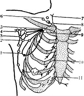 释义 | 临床表现 乳腺癌是40岁以上妇女中常见的恶性肿瘤,有家族史者患病的危险更大。未产妇患病的机会明显高于经产妇。男女之比为1∶100。大约6%的病人会出现对侧乳腺癌。 8.3.1 一般表现 早期乳腺癌的典型表现是单发的无痛性活动良好的结节性肿块。晚期可有皮肤溃破,肿块固定于皮肤、胸肌或肋骨。也可出现局部持续性胀疼,皮肤萎缩,乳头凹陷及皮肤红肿。典型病变表现为桔皮样。许多病人就诊时已伴有腋下和(或)锁骨上淋巴结转移。少数病人甚至以远处转移如肺转移为主要症状而就诊。 8.3.2 乳腺癌的扩散 乳腺癌发生腋下淋巴结转移的机率很高,不少病人就诊时已有临床阳性的腋下淋巴结转移。体检时未发现肿大淋巴结而术后证实有转移者可高达38%。乳房内象限及中央型病灶易发生胸骨旁即内乳区淋巴结转移(分别为31%和41%)。腋下已有淋巴结转移者内乳区淋巴结转移率高达54%(图8-1)。 图8-1 乳腺癌播散三条主要途径 (腋下、内乳、锁骨上) 1.胸肌后路 2.胸肌内淋巴结 3.中心组淋巴结 4.腋静脉组淋巴结 5.锁骨下淋巴结 6.锁骨上淋巴结 7.内颈路 8.下颈深淋巴结 9.胸肌间路 10.内乳路 11.心包前淋巴结 10%~15%乳腺癌病人就诊时已有潜在的远处转移。术前腋淋巴结转移的病人经全身骨扫描证实20%的病人已有骨转移。尸体解剖表明,远处转移常见的部位是肺(60%~80%),肝脏(50%~60%),骨(50%)等。 |