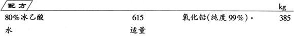 先用水将冰乙酸配制成浓度为80%的醋酸,再和氧化铅粉在60℃时进行反应,制得乙酸铅粗品,经蒸发浓缩、冷却结晶、离心分离、热风干燥和粉碎包装等工序,即可制得成品。