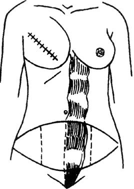 释义 | 乳房再造术 乳房再造术多见于乳房肿瘤切除术后。乳房根治术后的缺损包括皮肤、胸部肌肉、乳腺乳头、乳晕和腋窝内容。所以乳房再造术必须提供充足的组织。整个乳房切除后会给妇女,尤其给年轻女性带来精神上的巨大痛苦,使其丧失了女性美的特有体形。Webster1984年报告85例在乳癌切除的同时行乳房再造,并且与单纯做根治性乳癌切除做了比较,结论是安全的、有效的。不但没有增加并发症和死亡率,而且又获得乳房的形态,有利于上肢的淋巴回流和伤口愈合。因此在乳癌切除的同时可以再造乳房。多数情况下乳癌切除后3~9个月后二次再造乳房。根据选择术式的不同,可采用不同的再造方法。如胸部有足够覆盖的皮肤和胸大肌存在,可于胸大肌下埋入人工乳房假体(见隆乳术)。局部无足够覆盖的皮肤和胸大肌者,可设计上腹部横行岛状肌皮瓣、背阔肌岛状肌皮瓣再造乳房。如果组织量不足,可在皮瓣下埋植假体。 背阔肌肌皮瓣重建乳房术 【应用解剖】 背阔肌肌皮瓣位于腰背部和腋部,是三角形的阔肌,也是身体转移幅度最大的皮瓣。可通过肩前、颈部皮下隧道转移到颈部或颌面部;也可转移至前臂中部,肘关节及上臂;还可转移至胸前进行乳房再造。由于该肌皮瓣组织厚度大,血运充沛,尤适用于乳癌根治术后锁骨下方显着瘪陷患者的修复与再造。 背阔肌腱膜起于下6个胸椎和全部腰椎的棘突,骶正中嵴及髂嵴后斜向外上,以扁腱止于肱骨结节沟,主要血供来自腋动脉第2段发出的肩胛下动脉的胸背动脉。该动脉下行越过大圆肌,沿背阔肌前缘深面与前锯肌之间向下内行,到肩胛骨下角稍上方入肌。入肌前血管蒂长约8.1cm,有同名静脉和神经伴行。其整个肌皮瓣上界为肩胛骨下角上3cm,下界为髂嵴上5cm,内界为距脊柱正中线外侧5cm,外界背阔肌外缘外5cm。因此,该肌皮瓣的切取面积是人体最大的肌皮瓣,血供丰富,血管蒂长,易移位移植。 【手术方法】 (1)设计。以胸肱联合下1.5cm处腋动脉发出的肩胛下动脉为标志,此为上点,以背阔肌在髂嵴附着处为下点,两点之连线即该肌皮瓣的轴线;肌皮瓣的前缘相当于腋后线位置,即背阔肌前缘,后缘可按需要确定,通常设计10~12cm,以便供区拉拢缝合,最宽可达18~20cm;长度一般以不超过背阔肌为度。 (2)切取、移位及成形乳房。按设计切取肌皮瓣。在背阔肌的深层,即前锯肌和胸壁浅位分离肌皮瓣,注意结扎血管,切断和结扎肩胛下动脉的前锯肌支,使胸背动脉与肌皮瓣完全游离。制备受区,切除原有瘢痕组织和多余的皮肤,将肌皮瓣转移至胸前部,缝合固定于胸前。为使再造的乳房外形良好,必要时可在肌皮瓣的肌肉侧做荷包缝合。如肌肉瓣较小而胸壁缺损较多,可在肌皮瓣下方植入硅胶囊假体等代用品。如果健侧乳房处于下垂状态可酌情悬吊或缩小成形,使两侧乳房形态、大小对称(图20-4)。 图20-4 背阔肌肌皮瓣的设计与转移 a.背阔肌肌皮瓣设计示意图1 b.背阔肌肌皮瓣的转移与固定 c.背阔肌肌皮瓣设计示意图2 d.背阔肌肌皮瓣的转移与固定 腹直肌肌皮瓣乳房再造术 【应用解剖】 腹直肌位于腹部前正中线两侧,上宽下窄。下端止于耻骨联合及耻骨嵴,上端起于剑突与第5~7肋软骨处。腹直肌位于腹直肌鞘内,两鞘间以白线相隔。白线在脐上呈带状,脐下呈线状。因此上部两肌腹相隔远,下部允许靠近。肌鞘前壁完整,后壁在脐下5.8cm处形成半环线,线下无后鞘为疏松结缔组织。 腹直肌肌皮瓣主要血供来自腹壁上、下动脉与伴行静脉。腹壁上动脉为胸廓内动脉的直接延续,它经剑突与肋弓之间,由腹直肌后鞘进入腹直肌内,后向下走行至脐附近与腹壁下深动脉分支吻合。该动脉起点外径1.6~2.1mm。腹壁下动脉是髂外动脉的分支,斜向上内方经腹直肌外缘,在半环线前穿出腹直肌后鞘进入腹直肌后向上走行。该动脉起点外径为2.5~3.4mm,血管蒂长约9.0cm。腹壁上、下血管发出肌皮穿支,提供腹直肌表面皮肤的血供。另外,腹壁浅血管,旋髂浅血管,第一腰动脉前支、皮支等血管也提供腹直肌表面皮肤的血供,并与肌皮穿支在脐周有丰富的吻合支。保留腹壁上、下血管之一即可保证肌皮瓣的血供。 【手术方法】 (1)设计。首先参照健侧乳房位置设计再造乳房的位置,画出受区的切口(图20-5)。设计以对侧上腹直肌前鞘以及腹壁上动、静脉为蒂的下腹部腹直肌肌皮瓣,可起到下腹壁去脂与重建乳房的双重作用(图20-6)。 图20-5 设计胸部受区切口及分离区 图20-6 以腹壁上动脉为蒂的下腹直肌肌皮瓣的设计 在腹壁无肥厚情况下,肌皮瓣所带的皮瓣位置也可根据病人的具体情况灵活设计。 (2)切取、移植、成形乳房。在下腹以腹壁上动脉为蒂的下腹直肌肌皮瓣为例,在皮瓣上缘切开皮肤、皮下达腹直肌前鞘,在腹直肌前鞘外缘和中线切开前鞘,显露腹直肌,在其下腹外侧找到腹壁下动脉,并在入肌点下切断腹直肌,将其上端肌肉缝合固定到皮下,以防肌肉与皮肤分离。沿腹直肌后面向上分离腹直肌皮瓣,在达腹直肌的肋骨止点。在其内侧注意保护腹壁上动脉,在下腹肌皮瓣成形的同时,将上腹皮肤沿对侧前鞘和腹外斜肌上广泛分离至肋弓。腹区成形的肌蒂瓣经上腹皮肤下隧道移位至受区。修复下腹缺损,移位脐孔,缝合切口。 横位胸腹易位皮瓣乳房再造术 乳癌根治术后常行术后放射治疗,或进行局部皮片移植,或是局部术后有广泛瘢痕组织,这时常需