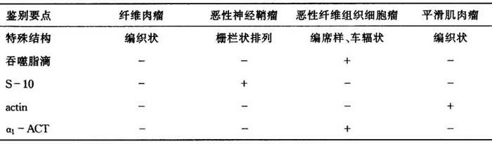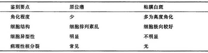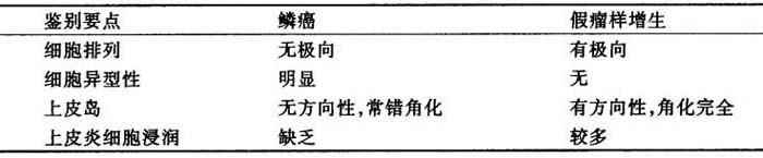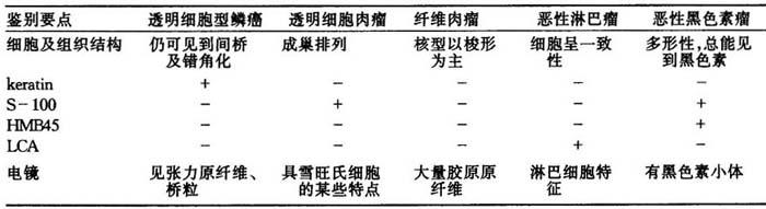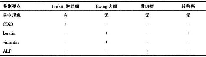 释义 | 二、恶性肿瘤 (一)原位癌 口腔粘膜的原位癌与宫颈原位癌不同,很少出现鳞状上皮全层的癌变,其表层往往有分化较好的角化层,它与粘膜白斑的鉴别见表14-4。 表14-4 原位癌与粘膜白斑的鉴别诊断 (二)鳞状细胞癌 是口腔肿瘤中发病率最高的一种,约占21.6%。高分化鳞状细胞癌常需要与鳞状上皮假瘤样增生相鉴别(表14-5)。 表14-5 鳞癌与假瘤样增生鉴别诊断 (三)疣状癌 见角化棘皮瘤。 (四)基底细胞癌 基底细胞上皮瘤可分为分化型与未分化型。分化型常见其向皮肤附属器方向分化,但两型之间无绝对的形态学界限。 (1)与非角化型鳞癌鉴别:后者细胞异型性明显,核分裂象多,癌巢周边无列兵样细胞排列。 (2)囊肿型及腺样型常需与毛发上皮瘤、低分化皮脂腺癌相鉴别。毛发上皮瘤常可见瘤细胞形成原始毛发的结构,细胞无异型性,无浸润性生长,无纤维组织反应。低分化皮脂腺癌癌巢周围细胞无典型的列兵样排列,癌巢的细胞往往有基底细胞样小细胞向皮脂腺细胞逐步分化的特点。 (3)腺样型与腺样囊性癌鉴别:后者细胞小,假腺腔样结构内含有PAS(+)物质,S-100(+)可与其鉴别。 (五)恶性黑色素瘤 瘤细胞的形态具有多样性,可呈多边形、圆形、卵圆形及梭形,胞浆可多可少,常有透明细胞形态。黑色素含量可多可少,甚至为无色素性。细胞排列也可出现多样性,可呈巢状排列,也可呈纤维肉瘤样排列,最多见为双向分化的结构。因此,当活检标本量较少,黑色素细胞不典型时,常易与透明细胞型鳞癌、透明细胞肉瘤、纤维肉瘤,甚至与恶性淋巴瘤相混淆(表14-6)。 表14-6 透明细胞型鳞癌与透明细胞肉瘤、纤维肉瘤、恶性淋巴瘤、恶性黑色素瘤鉴别诊断 (六)纤维肉瘤 口腔、颌面部纤维肉瘤不多见,应与侵袭性纤维瘤、恶性纤维组织细胞瘤、恶性神经鞘瘤、平滑肌肉瘤及结节性筋膜炎相鉴别(表14-7和表14-8)。 表14-7 纤维肉瘤与侵袭性纤维瘤及结节性筋膜炎鉴别诊断 表14-8 纤维肉瘤与恶性神经鞘瘤、恶性纤维组织细胞瘤、平滑肌肉瘤鉴别诊断 (七)Burkitt淋巴瘤 常见于非洲儿童,我国儿童常散发存在。肿瘤由B系统来源的小核裂细胞为背景,并由吞噬性组织细胞构成特征性“星空”现象。应与Ewing肉瘤、转移性小细胞癌、小圆细胞型骨肉瘤相鉴别(表14-9)。 表14-9 Burkitt淋巴瘤与转移性小细胞癌、小圆细胞型骨肉瘤鉴别诊断 |