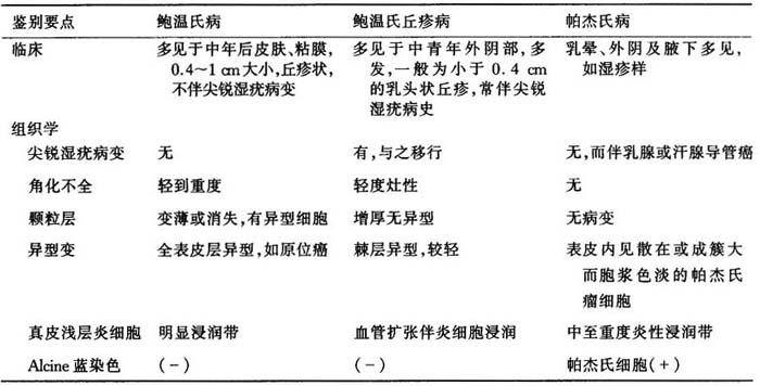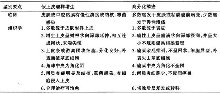 释义 | 二、恶性肿瘤的鉴别诊断 (一)光化性唇炎(皮角) 临床:又称指样日光角化病。损害呈指样突起,坚硬,基底潮红,好发于头皮及面部。 组织学:除日光角化病的特点外,突起由过度角化所致,表层下部有不典型角化细胞(角化不良细胞)。易恶变。 鉴别诊断:见表12-2。 (二)角化棘皮瘤 临床:为有潜在恶性的肿瘤,但有时可自行消退。单发型:多见于老年人面部及手背,1~2cm半球状结节,中央为充满角质的火山口状凹陷;多发型:常见于年轻人,皮损类似单发型;发疹型:由成千个2~3mm毛囊性丘疹组成,可波及口腔及喉粘膜。 组织学:①早期损害:表皮向下凹陷呈火山口状,其内充满角化及角化不全物质;下陷的表皮内有数个毛囊漏斗部上皮向下增生,瘤体周围有淋巴细胞浸润。②成熟期:“火山口”内充满角质物及炎细胞碎片,瘤体内细胞角化广泛,有角珠形成;部分细胞显示一定的异型性,细胞大小不一,深染,核分裂象多见;肿瘤内有大量嗜中性粒细胞浸润,其间可见棘松解细胞,有时可见嗜酸性脓肿;肿瘤的境界清,瘤体两侧的上皮细胞呈抱球状。③消退期:瘤体周围的肉芽组织逐渐纤维化,凹陷变平,角栓消失。易恶变。 鉴别诊断:见表12-2。 (三)鲍温氏病(表皮内癌) 临床:中年后发病,见于全身任何部位及粘膜;皮损初期为暗红色丘疹,境界清,边缘不规则,结痂剥离后呈湿润颗粒状。 组织学:原位癌改变。①表皮增生,棘层肥厚,表皮突增宽;②角化过度及角化不全,可见不典型细胞及角化不良细胞累及全层,基底膜完整;③真皮浅层中等密度的炎细胞浸润,以淋巴细胞为主。 鉴别诊断:见表12-3。 表12-3 鲍温氏病、鲍温氏丘疹病、帕杰氏病的鉴别诊断 (四)鲍温氏样丘疹病 临床:①多见于中青年,好发于外阴,如男性阴茎、龟头,女性阴唇及会阴;②皮损为棕色轻度乳头状丘疹,质软,2~5mm;③患者常有尖锐湿疣病史,易误诊为尖锐湿疣。 组织学:表皮乳头瘤样增生,灶状颗粒层增厚,乳头顶部角化不全;细胞排列密集,有一定异型性,极向紊乱;真皮浅层毛细血管扩张伴中等密度淋巴细胞浸润。 鉴别诊断:见表12-3。 (五)增殖性红斑 临床:多见于男性外生殖器及女性外阴或口腔粘摸;皮损为境界清楚的红斑,或呈隆起硬结,或呈乳头瘤状,可破溃糜烂。 组织学:同鲍温氏病,不同的是本病发生于粘膜,角化不明显,真皮上部炎细胞浸润以浆细胞为主,血管多,血管内皮细胞增生。 (六)湿疹样癌(帕杰氏病,Paget’s Disease) 临床:①孤立性红斑,稍隆起,境界清,部分病例呈湿疹样外观;②乳房湿疹样癌起始于乳头,逐渐向外扩展,组织发生于乳管腺上皮;③乳房外湿疹样癌好发于大汗腺分布的部位,如会阴、肛周及腋窝等,组织发生于大汗腺。 组织学:数量不等的Paget细胞浸润,单个或细胞成簇;细胞大,胞浆丰富,灰白色,卵圆形核,嗜酸性核仁;淀粉酶消化后,PAS染色和Alcine蓝染色阳性,这些特点可与鲍温氏病和表浅播散型恶性黑色素瘤鉴别。 鉴别诊断:见表12-3。 (七)鳞状细胞癌 临床:好发于老年人头面部,早期为浸润性斑块,进一步发展为结节,呈菜花状或形成溃疡。 组织学:鳞状上皮的极向紊乱,癌细胞呈巢状、乳头状、带状或腺样,向下浸润突破基底膜,成不规则癌巢。细胞异型性明显,角化不良细胞及核分裂象多见,并可见角珠,中央为角化不全;梭形细胞癌与未分化癌无角化现象,无细胞间桥,诊断时应与肉瘤及其他肿瘤鉴别。鳞癌免疫组化染色角蛋白阳性,电镜下可见大量的张力原纤维与桥粒连接。 鉴别诊断:见表12-4。 表12-4 假上皮瘤样增生与高分化鳞癌的鉴别要点 (八)假上皮瘤样增生与高分化鳞癌的鉴别 皮肤或口腔粘膜慢性溃疡或结核、霉菌感染时表皮或附件上皮可产生上皮瘤样增生,且可见到角化珠等。与高分化鳞癌很相似,应注意鉴别。 (九)基底细胞癌 临床:又称基底细胞上皮瘤。好发于面颊部。一般临床分为7型:结节溃疡型、色素型、硬斑病样型、浅表型、纤维上皮瘤型、基底鳞状细胞癌型、基底细胞痣综合征型。 组织学:基底细胞癌的形态复杂多样,其基本诊断要点是:①瘤体由基底样细胞构成,细胞间无细胞间桥,细胞形态比较一致;②周边细胞呈栅栏状排列,或有栅栏状排列的倾向;③肿瘤细胞团与周围间质间常有裂隙。 基底细胞癌类似正常的基底细胞,具有多向分化的潜能及表型,如向棘细胞分化形成基底细胞鳞癌,向毛囊分化形成角化性基底细胞癌,向皮脂腺分化形成囊性基底细胞癌,向汗腺分化形成腺样基底细胞癌。此外,常见的类型还有:浅表性基底细胞癌、色素性基底细胞癌、纤维上皮性基底细胞癌、釉彩状基底细胞癌(发生自口腔成釉细胞)等多种亚型。 (十)基底细胞痣综合征 临床:属于显性遗传性疾病。儿童或青春期在面部出现数百个小结节,后转变为基底细胞癌;常合并掌跖点状凹陷,多发性骨损伤,脊柱侧突及神经系统损伤。 组织学:同基底细胞癌。 |