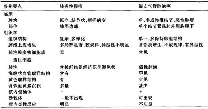 释义 | 二、有乳头状结构肿瘤的鉴别诊断 不论原发性或转移性肺肿瘤,有乳头状结构者较多。原发瘤有炎性假瘤、硬化性血管瘤、类癌、乳头状腺癌、细支气管肺泡癌、肺母细胞瘤等。转移癌来自乳腺、结肠、胰腺、前列腺、卵巢、甲状腺及肾等。另外,还有良、恶性间皮瘤亦可见乳头状结构,可根据临床特点、发病部位、各自组织学特点,并借助于免疫组化及电镜观察加以鉴别。 (一)肺硬化性血管瘤与炎性假瘤的鉴别 硬化性血管瘤曾一度认为是炎性假瘤的一个亚型,但人们发现该瘤具有独自的一些特征,如好发于40岁左右女性,常为境界清楚、缓慢增大的球形肿块,局部切除效果好。光镜下,与炎性假瘤不同,瘤组织内无炎细胞浸润,组织学常有三大特征性改变:①部分肺泡呈乳头状增生,常与细支气上皮相延续;②部分瘤细胞呈多角形,胞浆嗜酸性,实性片状排列在乳头内;③肺泡腔内大量出血,似海绵状血管瘤,另外伴血管增生,管壁硬化,透明变性。电镜下瘤细胞有指状突起、微绒毛、板层小体及神经内分泌颗粒,细胞间有桥粒连接;免疫组化检测乳头增生区角蛋白、表面活性物质载体蛋白阳性;在实性片状区NSE、CgA、Sgn等神经内分泌标记阳性。故近年来认为该瘤是起源于肺呼吸性细支气管和肺泡上皮细胞的良性肿瘤,而非炎性假瘤。而李维华等(Am Surg Pathol,1997;21:1013)通过免疫组化检测及电镜观察,证实该瘤为一种肺的神经内分泌良性肿瘤。 (二)肺炎性假瘤与细支气管肺泡细胞瘤的鉴别 肺的炎性假瘤肺泡上皮有时增生显着,呈乳头状,如不全面观察,则易误诊为细支气管肺泡癌,特别在有时增生的肺泡上皮较活跃,核增大,具有一定的异型性时,要注意与细支气管肺泡细胞癌鉴别,要点见表4-3。 表4-3 肺炎性假瘤与细支气管肺泡癌的鉴别 (三)肺乳头状腺瘤与乳头状腺癌的鉴别 自1982年Fantone报道了肺乳头状腺瘤以来,近年来陆续有些报告,本瘤被认为是发生于末梢气道Clara和Ⅱ型肺泡的肿瘤,目前在肺腺癌发病率增高的趋势下,作为一个单独类型与肺乳头状腺癌鉴别有重要的临床实际意义,见表4-4。 表4-4 肺乳头状腺瘤与乳头状腺癌的鉴别 (四)肺乳头状腺瘤与乳头型细支气管肺泡癌的鉴别 肺乳头状腺瘤亦发生在肺的外周部,需要与单个结节乳头型细支气管肺泡细胞癌相鉴别,见表4-5。 表4-5 肺乳头状腺瘤与乳头型细支气管肺泡癌的鉴别 |