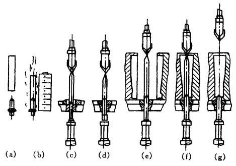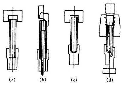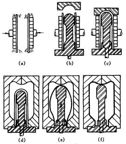 释义 | 二步法挤拉吹 此法采用挤出成型的管材为型坯,故又称为“冷管拉伸吹塑”。 图15-33表示了美国Beloit公司开发的冷管拉伸吹塑过程。将挤出成型的管材切成一定长度,储存。拉伸吹塑时,夹持管坯,放在烘箱中加热,见图15-33(a);接着成型颈部螺纹,见图15-33(b);之后,封闭管坯端部,成型容器的底部,见图15-33(c);然后,管坯连同芯杆转到拉伸/吹塑模具中,此时,芯杆起拉伸的作用,轴向拉伸管坯,见图15-33(d);再次,注入压缩空气,以径向吹胀管坯,见图15-33(e);最后,冷却定型,见图15-33(f)。 图15-33 Beloit冷管拉伸吹塑过程 (a)加热管坯 (b)成型颈部 (c)封接底部 (d)拉伸 (e)吹塑 (f)冷却 在Corpoplast拉伸吹塑(由法国Krupp Corpoplast公司开发)过程中,先加热管坯的一端,见图15-34(a);使此端封闭,见图15-34(b);接着加热另一端,见图15-34(c);用压塑法成型瓶颈部,见图15-34(d);然后加热整段管坯,拉伸吹塑成瓶,此法可用于由PVC拉伸吹塑啤酒瓶。 图15-34 Corpoplast拉伸吹塑过程中型坯的预处理 图15-35所示的Orbet拉伸吹塑(由Phillips66公司开发)过程中,先把管坯套在转动杆上,见图15-35(a);接着送入电加热烘箱中,见图15-35(b);然后,用夹具夹住被加热管的一端,使其封闭,并将另一端置于进气杆上,见图15-35(c);再接着,模颈圈闭合,进气杆向上伸出,以压塑成型颈部螺纹,见图15-35(d);其后,夹具向上移动,以轴向拉伸整个管坯(包括颈部),见图15-35(e);吹塑模具闭合,切去瓶底部尾料,如图15-35(f);注入压缩空气,吹胀型坯,尾料由夹具带走,见图15-35(g)。此法特别适用于PP。 图15-35 Orbet拉伸吹塑过程 |