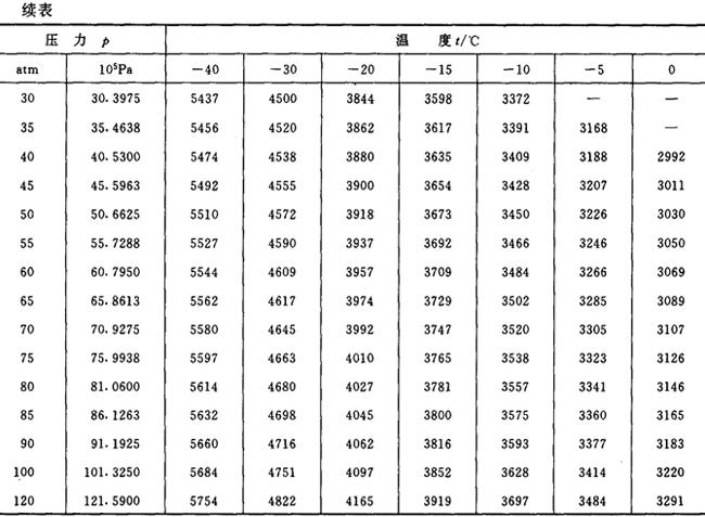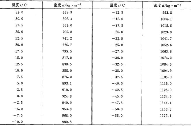 释义 | 二氧化碳的物理性质 二氧化碳是一种无色、无味、无毒物质。化学分子式为CO2。相对分子质量为44。在101.3kPa压力下沸点为-78.52℃。临界温度为31.0℃,临界压力为73.8×10-5Pa,临界比体积为2.456m3/kg。凝固温度为-56.6C。固体二氧化碳又称干冰,干冰的分子结构与特性是稳定的。二氧化碳是一种良好的制冷剂和食品添加剂。 (一)液体二氧化碳的密度 液体二氧化碳的密度受压力的影响甚微,而受温度的影响较大。液体二氧化碳的密度见表1-2-9。 表1-2-9 液体二氧化碳的密度 (二)二氧化碳的粘度 二氧化碳的粘度见表1-2-10。 表1-2-10 二氧化碳的粘度 单位:mPa·s (三)二氧化碳的热容 液体二氧化碳的质量热容数值见表1-2-11。 表1-2-11 液体二氧化碳的质量热容数 不同温度和压力下的气体二氧化碳的热容数见表1-2-12。 表1-2-12 气体二氧化碳的质量热容数 单位:kJ/(kmol·℃) (四)二氧化碳的导热系数 二氧化碳的导热系数见表1-2-13。 表1-2-13 二氧化碳的导热系数 单位:2.39×107kJ/(m·s·℃) (五)二氧化碳的比体积和焓 二氧化碳的比体积和焓见表1-2-14。 表1-2-14 二氧化碳的比体积和焓 注:①实线以上的凝相是固体,实线以下的是液体。 (六)二氧化碳的临界性质 纯二氧化碳的p-t相图见图1-2-2。 图1-2-2 CO2相图 图中蒸汽压曲线Ig始于三相点(气、液、固三种状态共存点)Tr,终止临界点c在三相点上,tTr=-56.42C,pTr=5.19×105Pa,气液固三相呈平衡状态。而在临界点c附近,气液两相形成连续的流体相区(用虚线画出的区域)。流体相既不同于一般的液相,也有别于一般的气相。c点所对应的温度tc=31.16℃,压力pc=7.16MPa,其临界体积Vc=94mL·mol-1。Is作为熔化压力曲线始于三相点Tr,随温度、压力的增加一直向上延伸,在-40℃时压力曲线可达7.09×108Pa(709MPa)左右。gs为升华曲线,其压力为固体二氧化碳在某些温度下的蒸汽压。 |