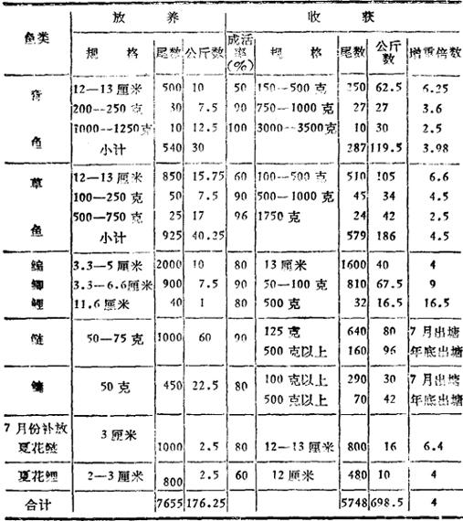 表2-46中鱼种与成鱼产量的比例和成鱼池相反,一般为成鱼30%,鱼种70%。