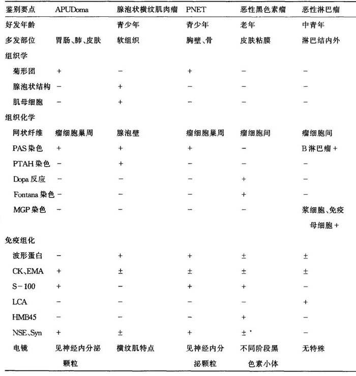 释义 | 五、原始神经外胚层瘤(primitive neuroectodermal tumor,PNET) PNET为神经嵴衍生的较原始肿瘤,主要由原始神经上皮细胞组成,可伴有多向分化的潜能,它可分为中枢性及外周性两类。与后者相关的还有外周性神经上皮瘤、外周性神经母细胞瘤、髓上皮瘤等。除发生于软组织外,它还包括骨尤文肉瘤、骨外尤文肉瘤、骨神经外胚层瘤、Askin瘤(好发于胸壁及肺)、婴儿色素性神经外胚层瘤。本瘤主要发生于生命的早期,临床上常表现为局限性肿块,但无包膜,以胸壁、脊柱旁、腹后壁及骨盆等处多见。本瘤细胞形态上如胚胎中未分化的原始神经外胚层细胞,具有多向分化的潜能,故而于肿瘤内常可见到神经源性、胶质细胞性的组织成分,甚至可见到间叶组织。本瘤组织特征性改变为瘤细胞为小圆细胞密集呈巢状排列,常被致密的纤维组织分隔成分叶状或腺泡状结构,有纤维性小梁形成,可见到神经性菊形团。NSE是PNET的特征性标记物,常呈强阳性,HNK-1、S-100蛋白、NF、CGA、突触素等均可为阳性。电镜观察见瘤细胞伸出神经突起,胞突内有微管,致密中心的小泡和突触小泡,有神经分泌颗粒和中间纤维丝、黑色素小体或黑色素前体。由于尤文瘤(EW)与PNET具有相同的核型和基因改变,O13染色阳性和少数病例中的神经表达,故认为EW从属于外周性PNET的家族。对EW/PNET的形态和免疫组化的研究表明,如将EW/PNET置于同一个家族中,则EW处于该家族瘤谱的较原始一端,而PNET位于有神经分化的另一端。其中H-W菊形团结构则是区分EW/PNET的重要形态学指征。O13抗体针对的是P30/32蛋白,此蛋白为MIC2基因产物,该基因表达与EW基因重组有关。故O13染色对确定EW/PNET以及与其他小细胞恶性肿瘤的鉴别具有重要意义。 总之,小细胞性肿瘤在常规组织学改变方面十分相似,明确其组织学来源很困难,需要仔细观察,努力寻找其特殊性改变。结合发生部位,考虑有哪些可能,再辅以免疫组化、电镜等手段,色素瘤多数可以明确诊断。现将较多见的几种恶性小细胞肿瘤鉴别列于表2-8。 表2-8 较多见的恶性小细胞肿瘤鉴别要点 |