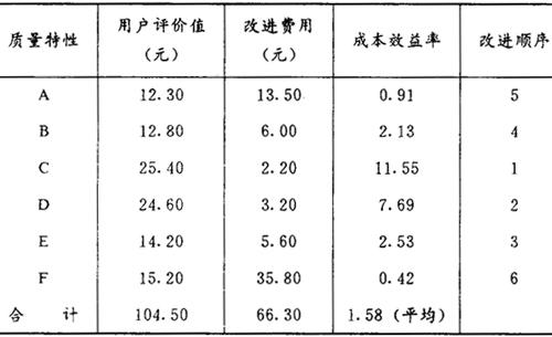 例:某电器产品共有6项质量特性值指标如表13-2所示。售价为1100元,现要进行质量改进,试确定哪些需要改进,及改进的顺序?