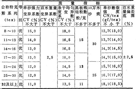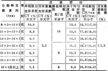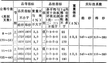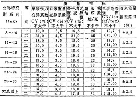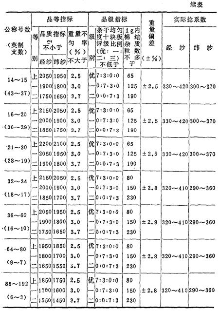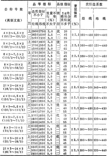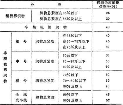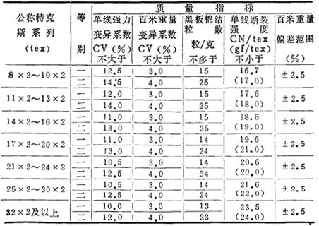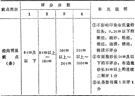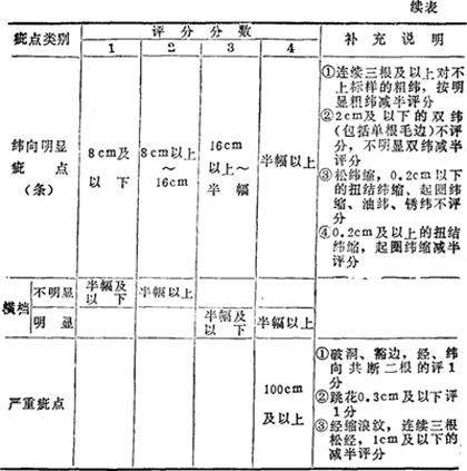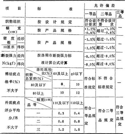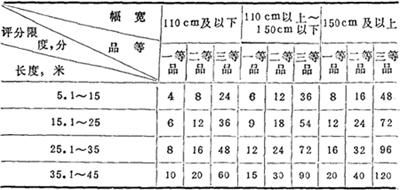 释义 | 产品质量标准 (一)纱线产品质量标准 1.本色棉纱线标准 GB398-78本色棉纱线标准,适用于鉴定环锭纺机织用棉纱线的品质。技术指标规定见表18-33至表18-36。 表18-33 梳棉单纱的技术指标 表18-34 精梳棉单纱的技术指标 表18-35 梳棉股线技术指标 表18-36 精梳棉股线技术指标 2.精梳涤棉混纺本色纱线 GB5324-89精梳涤棉混纺本色纱线标准,适用于鉴定环锭纺涤纶(棉型短纤维)与棉混纺,涤纶混用比例在60%及以上的精梳涤棉混纺本色纱线的品质,其技术要求见表18-37至表18-40。 表18-37 精梳涤棉混纺本色纱(涤纶含量在60%及以上)的技术要求 表18-38 精梳涤棉混纺本色纱(涤纶含量在60%及以上)优等品的技术要求 表18-39 精梳涤棉混纺本色线(涤纶含量在60%及以上)的技术要求 表18-40 精梳涤棉混纺本色线(涤纶含量在60%及以上)优等品的技术要求 (二)棉布质量标准 1.本色棉布 GB407-78《本色棉布分等规定》,此标准适用于鉴定有梭织机生产的本色棉布的品质(不包括提花、割绒等织物)。 1)分等规定 本色棉布以匹为单位,由物理指标、棉结杂质与布面疵点相结合按表18-41定等,分为一等品、二等品、三等品,低于三等品者为等外品。 表18-41 本色棉布分等规定 2)物理指标、棉结杂质的评等 棉布物理指标、棉结杂质分批试验,按批评等,按GB407-78《本色棉布试验方法》进行试验,以一次试验结果为评等依据。物理指标、棉结杂质稳定时,可延长试验周期,但每周至少试验一次。如遇原料及工艺变动较大或物理指标及棉结杂质降等时,应立即进行逐批试验,直至连续三批不降等后,方可恢复原定试验周期。 各项物理指标超过下列允许公差者为二等品。 (1)10cm的经、纬密度:经密-1.5%(幅宽超过标准1%时为-2%);纬密-1.0%。 (2)经、纬向断裂强度:-8%。其中经、纬纱密度,因个别机台的筘号或纬密牙轮用错,造成经、纬密度不符合规格的,该个别机台所生产的布匹,如确能划分清楚的,可将这部分布匹剔除,降等处理,该批布重新取样试验定等。如划不清楚并超过标准允许公差范围的作全批降等。棉结杂质的疵点格率按表18-42规定,超过者为二等品。 表18-42 本色棉布棉结杂质疵点格率规定 注:①本色棉布按经、纬纱平均号数分类:细号织物:11~20号;中号织物:21~30号;粗号织物:32号及以上。 ②使用专纺二级纱的非精梳织物,其棉结杂质的疵点格率为表18-42疵点格率数的130%(小数四舍五入为整数)。 各项物理指标、棉结杂质的品等不同时,按最低的一项品等作为该批棉布物理指标、棉结杂质的品等。 3)布面疵点的评等 布面疵点逐匹检验评分,按匹评等。评分以布的正面为准。平纹织物、山形斜纹织物以交接班印的一面为正面;斜纹织物:纱织物以左斜“↖”为正面,线织物以右斜“↗”为正面。 布面疵点的评分以40m为约定长度,以110cm及以下为约定幅宽,其评分累计限度为:一等品不大于10分;二等品不大于20分;三等品不大于60分;超过60分的为等外品。 不同长度、不同幅度的布面疵点评分限度按表18-43规定。 表18-43 本色棉布布面疵点评分限度规定 注:①超过三等品评分限度的为等外品。 ②凡一等品评分限度在10分以上,1/2m内及连续性疵点超过1/2m累计评分满11分的,仍应降为二等品。 ③凡规定匹长超过40m的,应加合其超出部分的评分限度,作为该匹布的评分限度。 2.精梳涤棉混纺本色布 GB5325-89《精梳涤棉混纺本色布》,此标准适用于鉴定有梭织机生产的、衣着用精梳涤棉混纺本色布的品质,不包括提花织物。 1)技术要求项目 精梳涤棉混纺本色布的技术要求包括织物组织、幅宽、密度断裂强力、棉结疵点格率、外观疵点等六项。 2)分等规定 精梳涤棉混纺本色布的品等分为优等品、一等品、二等品和三等品。低于三等品为等外品。 精梳涤棉混纺本色布的评等以匹为单位。织物组织、幅宽、外观疵点按匹评等,密度、断裂强力、棉结疵点格率按批评等,并以六项中最低的品等为该匹布的品等。分等规定如表18-44。 表18-44 精梳涤棉混纺本色布分等规定 注:幅宽、经纬向密度必须保证成包后符合上表规定。 3)优等品条件 在达到一等品各项条件的基础上,符合下列条件评为优等品:①细特平纹织物横档疵点每匹最多允许三条;②不能带有单个评为4分的疵点;③不能带有1m及以上的长条影(用下灯光或对光照检验);④外观疵点平均每米分数不大于以下规定:每米允许分数:幅宽110cm及以下为0.15分/米;幅宽110cm以上~150cm为0.20分/米;幅宽150cm以上为0.25分/米;⑤棉结疵点格率为一等品的50%。 4)外观疵点评分 外观疵点检验条件:检验时的照明光度为400±100L×,验布机线速度不超过20m/min;外观疵点按表18-45评分。 表18-45 精梳涤棉混纺本色布外观疵点评分标准 每匹布允许总评分=每米允许评分数(分/米)×匹长(米),每匹布允许总评分有小数时,取舍成整数,1米中累计评分最多4分。 检验布面疵点时,应将布平放在工作台上,检验人员站在工作台旁,以能清楚看到的为明显疵点。不论采用单层或双层检验方式,以最能显示疵点程度为准。 |
