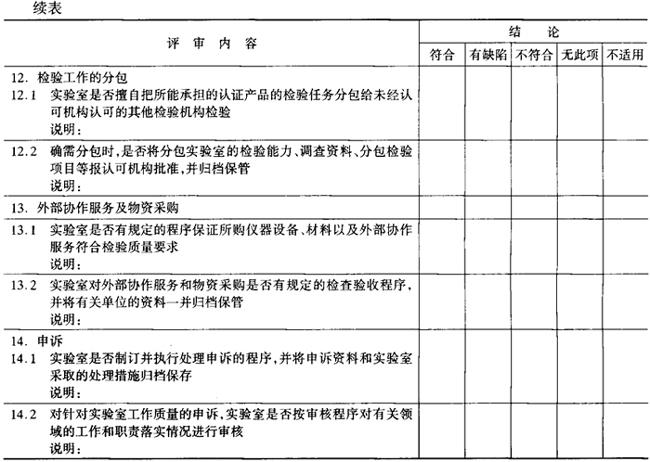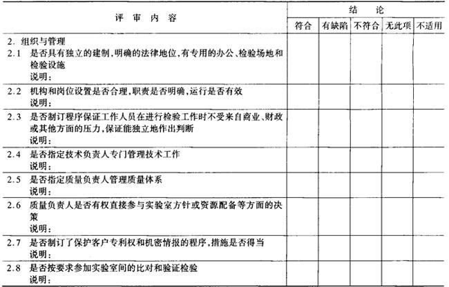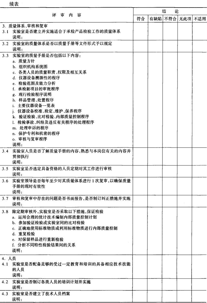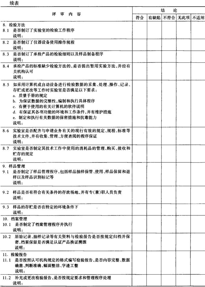 释义 | 产品质量认证检验机构评审报告 产品质量认证检验机构评审报告 评审机构____ 评审日期 1.概况 1.1 认可机构: 1.2 评审组组长姓名: 评审员姓名: 1.3 申请认可单位全称: 地址: 电话: 传真: 邮政编码: 1.4 检验实验室名称(如与1.3不同): 地址: 电话: 传真: 邮政编码: 1.5 检验实验室申请认可所提供的资料是否完整、准确? 1.6 认可检验标准: 1.7 认可检验范围: 1.8 陪同评审的检验实验室代表及其职务: 1.9 其他情况 2.评审综合意见 2.1 检验机构评审意见 建议认可机构 a.无欠缺 □可授证书 b.存在部分欠缺 □确认纠正措施,将整改结果报告认可机构,可授证书 c.存在较多欠缺 □评审暂停,提出整改书面报告后复审,达到a、b要求可授证书 d.存在严重欠缺 □终止评审,重新申请 注:用标记符号方法表述评审结论意见 2.2 把有关问题列出,如可能,再说明实验室拟采取的纠正措施。 2.3 备注(上述各项不包括的任何问题可在此列出,诸如评审气氛等问题)。 评审员签名: 评审组组长签名: 地点: 日期: 申请认可机构代表签名: 日: (附评审内容——编者) |