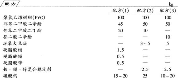 分别将配方(1)、配方(2)和配方(3)中全部物料充分混合均匀,分别制得3种人造革料。按工艺要求加工,制成人造革。