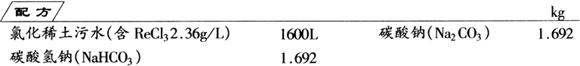 取含稀土的污水1600L,加沉淀剂Na2CO3、NaHCO3,搅拌。加完后使终点pH=6.45~7。静置、沉降,采用框板过滤机在0.4MPa压力下过滤。滤液中ReCl3含量为0.012g/L,去除率达99.5%。沉淀加盐酸可转变为ReCl3而回用。