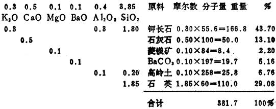 释义 | 从釉式计算生釉配方 釉式为: 计算其配方: 1)使用的原料全部当作纯物质。 2)将釉式横行排列,先取与其它成分也有关系的长石满足釉式中的碱性成分,然后对各项进行逐项满足及联减计算,得出的数乘以各自的分子量,再换算成百分数,即为配方。 3)另外,如果给出的是各原料的实际化学成分,应将其换算成原料的分子式,再以上述方法进行计算。 |