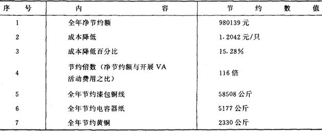 释义 | 价值分析在X型点火线圈中的应用 某电器厂是生产汽车、拖拉机配套用电器的专业工厂,其中X型点火线圈是批量较大的一种产品,年产量达100万只左右,占全厂总产值40%左右。该产品虽然在1980年被评为上海市优质产品,但基本上是50年代的仿苏产品,设计保守、工艺落后,成本偏高,在性能上与国际先进产品相比,还有差距。为此,从1979年开始,以该产品为对象,收集和分析有关情报资料,在厂部价值工程办公室的统一规划下,从探讨提高产品功能,降低生产成本入手,开展了价值分析活动。通过一年多的实践,取得了明显的效果。现将他们的具体做法,介绍如下: 一、零部件成本分布与功能评价 X型点火线圈共有67个零件,通过ABC分析,零件成本在1.00元以上的零件有3项,成本在0.10~0.70元之间的零部件有12项。前者3项零件成本占产品成本58.7%,属于A类零件,其余零件的成本均在0.10元以下,都属于C类零件。价值分析的重点是A、B两类零件。 A、B两类的现状成本如表1所示。 表1 A、B类零件现状成本分析 点火圈是汽油发动机电气点火系统中,点火引爆的主要电器之一,其基本功能是将低压脉冲电变换为高压脉冲电。点火线圈的高压脉冲电应保证在发动机火花间隙中,产生足够能量的连续电火花,以能充分点燃气缸内的混合气体。点火线圈的功能系统图见下图: DQ130型点火线圈功能系统图 点火线圈的基本功能是通过各个零部件的功能实现的,为了对A、B类零件进行功能评价,采用强制确定法,把各个零件之间,按它们功能的重要性,一对一地进行比较,功能重要的得1分,功能相对不重要的得0分。此工作有9位技术人员参加,各自分别进行评分,如第一号评价者的功能评价结果如表2所示。 表2 功能评价表 把9位评价者的评价结果汇总,可确定每项零部件的评价系数,数据如表3所示。 表3 功能评价系数计算 二、产品更新方向与成本分配的确定 收集有关国内外点火线圈的样品和资料,在分析研究的基础上,选择了在东南亚市场有较大影响并具有代表性的日本海星牌点火线圈与该厂产品进行比较,将DQ130型点火线圈与日本海星HP5-10点火线圈,按日本汽车用点火线圈标准(JISD5121-1972)作对比试验,该厂产品在高速点火性能方面(火花长度9毫米)低于日本产品(火花长度9.5毫米),这是外贸竞争的技术关键之一。另外,根据外商和用户的需要,将X型点火线圈外表单一黑色改为多种彩色,安装支架由固定式改为活动装配等。总的说来,要提高产品的使用功能和外观功能。 从X型点火线圈的成本来看,与国内同类产品比较,该厂生产的点火线圈成本最低。从厂各类汽车电器产品来看,一般电器产品的利润率为出厂价的30%左右,但X型点火利润率为出厂价的14.2%。目前该厂出口点火线圈的利润收益低于国内销售的利润收益,因而为了扩大出口范围和数量,加强出口竞争能力,增加企业经济效益有必要降低X型点火线圈的成本。 从X型点火线圈主要零部件用评价系数分配的成本与目前的差价表(见表4)中可看出,有4个零部件的价值系数小于1。其中初级线圈的价值系数是0.74,次级线圈的价值系数是0.41,成本分配偏高,应降低它们的成本,从而使整个点火线圈的成本降低。 表4 用评价系数分配的成本与目前成本差价表 三、选择和评价提案 改进点火线圈设计,就是改进初、次级线圈的绕线参数和改进磁路系统零件的材料和结构。从技术上看,原产品设计思想保守,选用漆包线线径过大,增加了不必要的成本,可以先从减细漆包线线径上考虑,以降低成本,再从提高次级线圈的输出电压和维持必须的能量来研究,对初、次级线圈漆包线线径、匝数和匝数比、电流、电压、电阻、电感、电容等设计参数提出各种设想,并归纳为三个方案进行试验。经试验证明:把X型点火线圈的次级线圈的线径从ψ0.09改为ψ0.08,初级线圈的线径从ψ0.71改为ψ0.67,同时增加次级线圈的匝数,减少初级线圈的匝数,增大初、次级线圈的匝数比,能提高输出电压,达到温升合格,提高点火性能,又降低成本的目标。 此外,通过改变异磁片及六角螺母材质,密封垫圈与绝缘套外协件降低,取消外壳的点焊、磷化工序,增加外壳支架镀锌钝化工艺等一系列措施,预计成本1.30元左右,较原成本降低16.5%,具体数据如表5所示。 表5 成本预测表 单位:元 在提案试验、分析评价和成本预测的基础上,最后形成一个具体的试制实施方案——价值分析提案书。 四、试验验证 根据批准的价值分析提案书的要求,严格按工艺规程试制样品,并对样品进行试验验证和交用户使用,以确定赶超日本海星牌点火线圈和满足优质品要求的实际效果。 1.型式试验 点火线圈试样经过台架试验后,全部符合优质品性能指标要求。从常温点火、高温点火、振动和冲击后的点火等可测火花长度来看,提高了30~60%,使用寿命达到80,000公里连续点火要求。 2.道路试验 负重道路试验是检验点火线圈能否适应车辆的实际运行能力,主要考核行车的可靠性、爬坡能力、温升和道路运行中的电参数。点火线圈装在负重4吨的交通牌载重汽车上在最大坡度为7°~8°的山区弯道,经历近48小时,累计1,429公里运行试验后,点火线圈工作可靠,温升、电压、电流等参数均属正常。 3.对比试验 X型点火线圈与日本海星牌HP5-10点火线圈实样的对比试验,按日本点火线圈标准(JISD5121-72)经历低速点火、高速点火、绝缘电阻、耐电压、耐