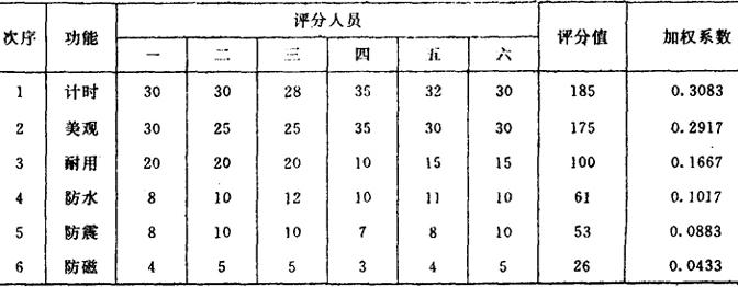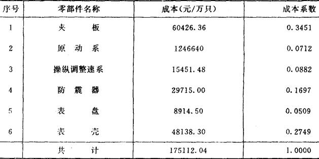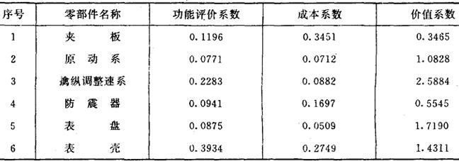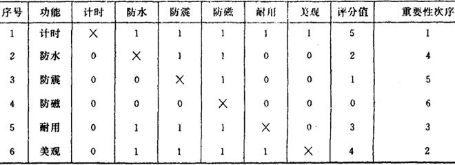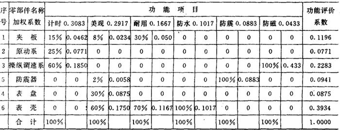 释义 | 价值工程在19钻统一机芯三防全钢手表中的应用 国产手表内在质量好,外观质量太差,价格无法提高。为了更新产品,以增强竞争能力,必须应用价值工程进行分析,针对缺点加以改进。 一、成本分布分析 将19钻统一机芯手表零件总数按140个计算,并给定其计算成本为187,810.94元/个。经ABC分析法将零件成本从高到低的程序排列(见表1)。 表1 19钻手表零件ABC分析表 二、产品功能分析和评价 基本功能:精确计时;辅助功能:防水、防磁、防震; 使用功能:耐用;外观功能:美观。 多功能重要性评价: (1)应用01评分法进行重要性次序评价(见表2)。 表2 功能重要性次序表 (2)进一步应用百分制评分法评定功能的加权系数,评定要点是按次序前后,前项评分值大于或等于后项,现将六位人员评分结果列于表中(见表3)。 表3 3.再对A、B组中六个重点零部件进行功能评价。应用定量评分法评定,得出六项重点零部件的功能评价系数(见表4)。 表4 重点零部件功能评价系数表 4.计算出六项重点零部件的成本系数(见表5)。