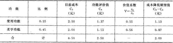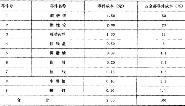 释义 | 价值工程在T4800型收音机调谐系统中的应用 T4800型落地式半导体收音机的调谐系统有9个零件,每个零件的成本见表1: 表1 从表中看出,调谐钮和惯性轮两件的成本占了全部零件成本的73%,应作为价值工程的重点对象。 惯性轮功能的成本,就是零件目前的成本2.08元。其成本构成为:工时费1.50元,材料费0.51元,电镀费0.07元,合计2.08元。 改进方案采用粉末冶金压制工艺,代替原来的车削加工。新工艺模具制造较简单,原材料可选用钢材的下脚料——氧化鳞皮。惯性轮的净重只有155克,而原工艺的毛重为500克,所以,节省大量钢材。还采用蒸气法来代替表面电镀,零件一次成型精度高。用这种方法促进了零件的标准化,可用于厂内今后生产的各种大型台式机。 用经验估算法,初步估算出新方案的最低成本为0.84元(包括模具费、材料费、加工费和包装费),也即功能评价值。成本降低的期望值C0-Ca=2.08-0.84=1.24元,成本下降约60%。 调谐钮的美学功能不容忽视。T4800机箱造型雅致大方,如果调谐钮的光洁度不够、精度不高的话,将使整个箱体外观逊色。经多次研究,决定按0.55∶0.45的比例来分摊目前成本。即使用功能成本为2.50元,美学功能成本为2.00元。 根据T4800收音机的出厂价,零售价与目前小批投产成本差距太大的现实情况,参考国内同类型机的成本,确定目标成本为2.50元。成本的分配情况见表2: