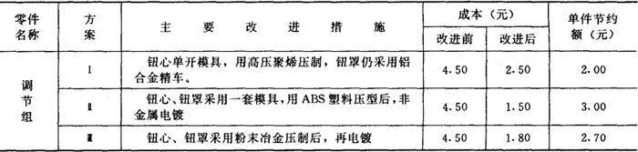 表2 现行方案调谐钮的钮心材料为尼龙1010,钮罩材料为铝合金精车制成。材料费昂贵是成本高的主要原因,经集思广益,提出三项改进方案。情况如表3: 表3 方案Ⅱ的模具精度问题尚待解决,不能马上实现;方案Ⅲ需外加工,一时尚难落实,而且粉末冶金压制后的电镀工艺,也有一些问题需要解决;方案Ⅰ的成本虽然较高,但目前可马上实现,并能保证使用功能和美学功能,故加以采用。 |