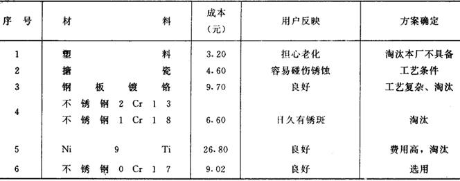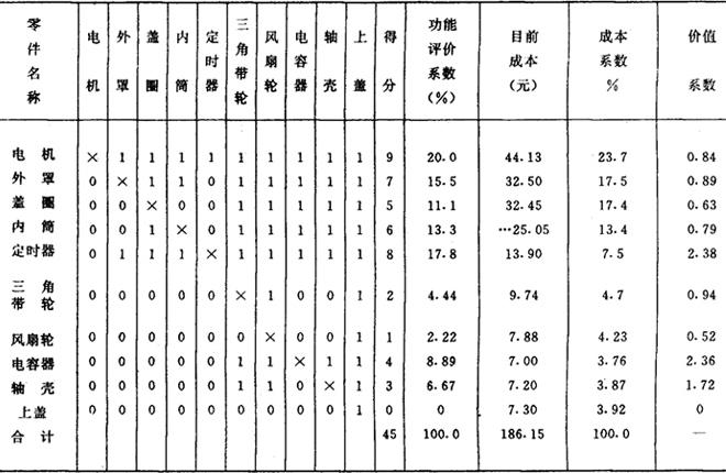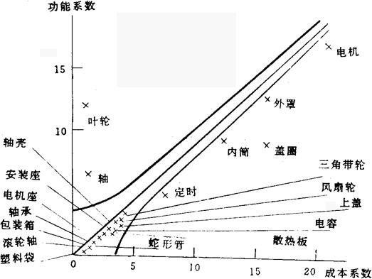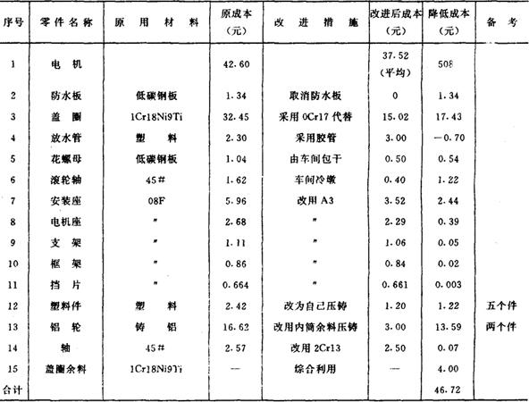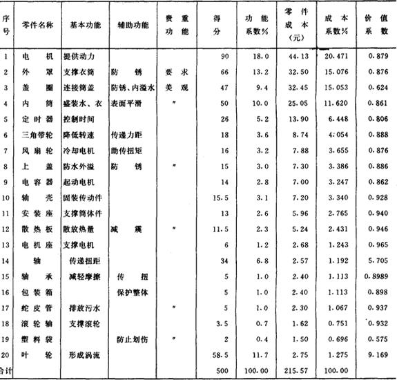 释义 | 价值工程在洗衣机改造中的应用 某机械厂原是生产军工产品的企业,在国民经济调整过程中,该厂增加了民用产品的生产,从一九八〇年开始生产航空牌1.5-1型洗衣机。由于该厂技术力量雄厚,设备精良,工艺先进,选材讲究,因此洗衣机质量良好,获得国家颁发的合格证书。但是,由于注重了产品质量,忽视了成本,使单台成本达240多元,而出厂价只有185元,大大亏本。市场预测结果表明,市场对洗衣机需求量很大,该厂将大幅度增加产量。在此情况下,降低成本就成为扩大洗衣机生产的关键。该厂应用价值工程技术,研究和改进洗衣机的功能与成本构成,在保证必要功能的前提下,大幅度降低成本,每台降到160多元,比原先降低了百分之三十多,成为颇受用户欢迎的产品 一、收集资料,分析产品成本 收集情报资料,是开展价值工程的基础工作。只有做到知己知彼,才能有的放矢地开展工作。具体收集以下两方面的资料。 1.市场情况(即企业外部情报) (1)对国内外四种不同类型洗衣机(即:喷流式、涡卷式、搅拌式、滚筒式)产品的性能、特点、主要资料及基本数据搜集、整理,这样就清楚地了解了本厂产品所具有的优点和不足。 (2)搜集国内同类产品各部件的有关资料,并加以分析和归纳。该厂先后购进六种类型的洗衣机,对不同厂家生产的洗衣机的耗电量、洗净比、漂洗比、电机温升、绝缘耐压及噪声等进行了测试,取得可靠数据。 (3)销售部门搜集了用户对本厂产品的意见,并对这些产见和建议进行登记归类,为产品的改进打下了基础。 2.企业内部情报 主要收集产品成本方面的资料,详细清点了外购件、原材料、各零件的工时定额、材料消耗定额和每小时的实际费用,计算出各零件的目前成本,初步摸清了洗衣机的实际成本。 此外,还收集了有关洗衣机生产所需要的新材料、新工艺等资料,都为以后的工作打下了基础。 二、确定价值分析的对象 1.根据价值工程原则,选择成本高的作为工作对象。画出产品成本构成图,见图1。 图1 产品成本构成图 由图可见,工时费用占39.3%,外购件和材料费分别占总成本的31%和27.5%。这表明,降低工时,提高生产效率,同时对一些设备进行更换,避免造成不必要的过高精度加工零件现象;外购部件和原材料,要严格把关,精心选择,避免使用功能过高的原材料,尽量选用质高价低的,这些是工作的重点。 2.运用ABC分析法进一步分析洗衣机本身各部件的成本。将洗衣机一百多个零件按其成本大小顺序排队,并算出它们各占产品成本的百分比。其中将7元以上的10个零件划为A类,这部分零件占总成本的74.6%;将成本为0.6元-7元的30个零件划为B类,B类占总成本的18.5%;其余60%的零件仅占总成本的6.9%。见表1。根据这些资料绘制巴雷特曲线图,见图2。 图2 ABC图 表1 洗衣机成本比重表 显然,将价值工程重点放在A、B两个区的零件上,特别是A类的10个零件。这10个零件是:电机、外罩、盖圈、内筒、定时器、三角带轮、风扇轮。价值系数大于1的,其因素可能很多,其中之一可能是成本偏低而实际没有达到应有的功能。至于价值系数为0的上盖,只说明它的功能与上述零件的功能相比最不重要,并不等于它可以取消。 表2 FD法计算表 三、功能分析与评价 在上述工作的基础上,对产品进行功能评价,即对每个零件进行功能定义,并绘制功能系统图(图略)。将洗衣机功能划分为四个区: (1)控制装置; (2)动力及传动装置; (3)容器装置; (4)外观及保护装置。 由功能系统图,更加明确了洗衣机各部分的基本功能及其实现的手段,并可看出,哪些功能是属于多余的,哪些是不足的。例如,设计中多次使用防震胶垫,有几处是多余的。防水板也可在稍作设计改进后取消。同时发现,该机外观功能不足,应予加强。在此基础上进行功能评价。其具体做法是选出成本高的二十个零件进行评价。组织设计员、车间主任、工艺员、生产工人等,利用综合评分法根据各零件的基本功能、辅助功能和外观功能给各零件打分。然后再求出功能系数、成本系数和价值系数。详见功能评价表3。 表3 洗衣机功能评价表 最后,采用最合适区域法,找出第一批需要立即改进的零部件。在绘制最合适区域图时,关键是对区域的确定,原则由大到小。所给曲线方程为:x2-y2=2b=10,即b值为5,见图3。 图3 最合适区域图 四、改进措施的研究与制定 确定价值工程重点对象以后,组织车间、班组工人以及技术、财会、计划、供销等有关人员,从功能和费用两方面及其综合上分析价值系数小的原因,并研究制定改进方案。 盖圈。其价值系数为0.624,小于1较多。其效用是连接内外筒和防腐、封严,起辅助功能作用。原先用1Cr18Ni9Ti不锈钢,每公斤价17.1元,单台材料价格达26.85元,可见存在过剩功能,成本过高。经过群众分析,共提出六个改进方案,见表4。 表4 最后确定选用OCr17材料,每公斤价格6元,用其代用后,单台成本降低17.43元。电机。其价值系数0.879,小于1。其原因是购进价偏高,每台42.6元。该厂成立由技术员、检验员、老工人组成的性能测试小组,将国内八家电器厂生产的十六台样机进行全面测试,进行分析对比,从中选出三种性能好,价格低的作为订货对象。仅此一项使单台成本降低5.08元。 挡水板。其功能只是防止往电机内进水。它装在风扇轮和电机中间,对冷却电机有副作用。经分析,只要稍加大风扇轮的尺寸就可起到挡水、防
