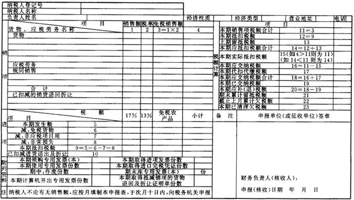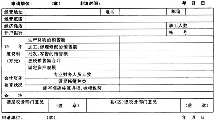 (2)交纳增值税的纳税人减免税中下列项目免征增值税:①农业(指种植业、养殖业、林业、牧业、水产业)生产者销售的自产农业产品;②避孕药品和用具;③古旧图书;④直接用于科学研究、科学试验和教学的进口仪器、设备;⑤外国政府、国际组织无偿援助的进口物质财货物和设备;⑥来料加工、来件装配和补偿贸易所需进口的设备;⑦由残疾人组织直接进口供残疾人专用物品;⑧销售的自己使用过的物品(是指游艇、摩托车、应征消费税的汽车以外的货物)。 7.增值税的管理 增值税的管理主要有两个方面,一是增值税纳税人登记,二是增值税专用发票管理。 (1)增值税纳税人登记。根据增值税条例规定,增值税纳税人分一般纳税人和小规模纳税人。这两类纳税人的适用税率和应纳科额的计算方法都不同。对小规模纳税人则不予登记。作为增值税的纳税人都应提出登记申请,由县级税务机关进行审核,符合条件的,准予登记,按一般纳税人对待,不符合条件的不予登记,按小规模纳税人对待。其主要内容包括: ①凡在我国境内销售货物或应税劳务,实行独立核算,并经工商行政管理部门批准开业的增值税纳税义务人,应在向当地税务机关办理税务登记的同时,申请办理一般纳税人认定手续。申办认定手续时,纳税人应向税务机关提供营业执照、有关经营合同、章程、协议书等资料,并填报增值税一般纳税人申请认定表。增值税一般纳税人申请认定表格式如图表3-11-2所示。 3-11-2 增值税一般的纳税人申请认定表