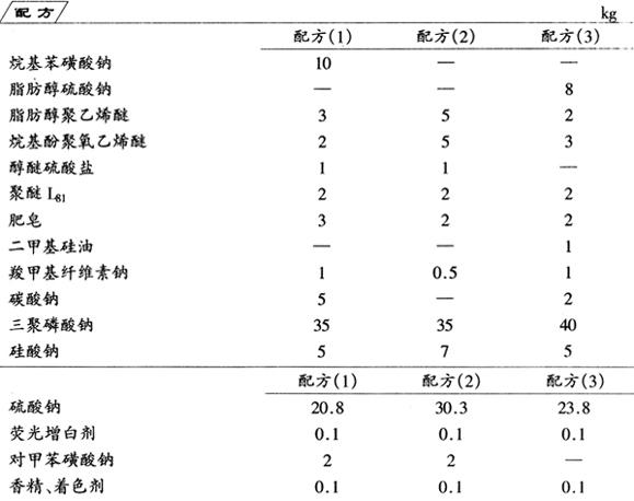 释义 | 低泡洗衣粉 制法 分别将配方(1)、配方(2)和配方(3)中前4或3种表面活性剂加入配料罐内,再加肥皂,搅拌均匀。加热到60~70℃,加硫酸钠后,加消泡剂聚醚或二甲基硅油,搅拌均匀。再加其他物料。喷粉、风送、冷却后加入香料,即分别制得3种产品。 这种洗衣粉为洁白空心颗粒。具有芳香气味。乙醇溶解物根据不同配方可达到±1%,成品含水量≥10%。泡沫少且稳定性差,去污性能好,且易于漂洗。主要供各种类型的洗衣机使用,由于泡沫少不致从洗衣机中溢出,手洗时容易漂清,可收到省时、省力、省电的效果。一般30g洗衣粉加5L水,即可用于洗涤。 |